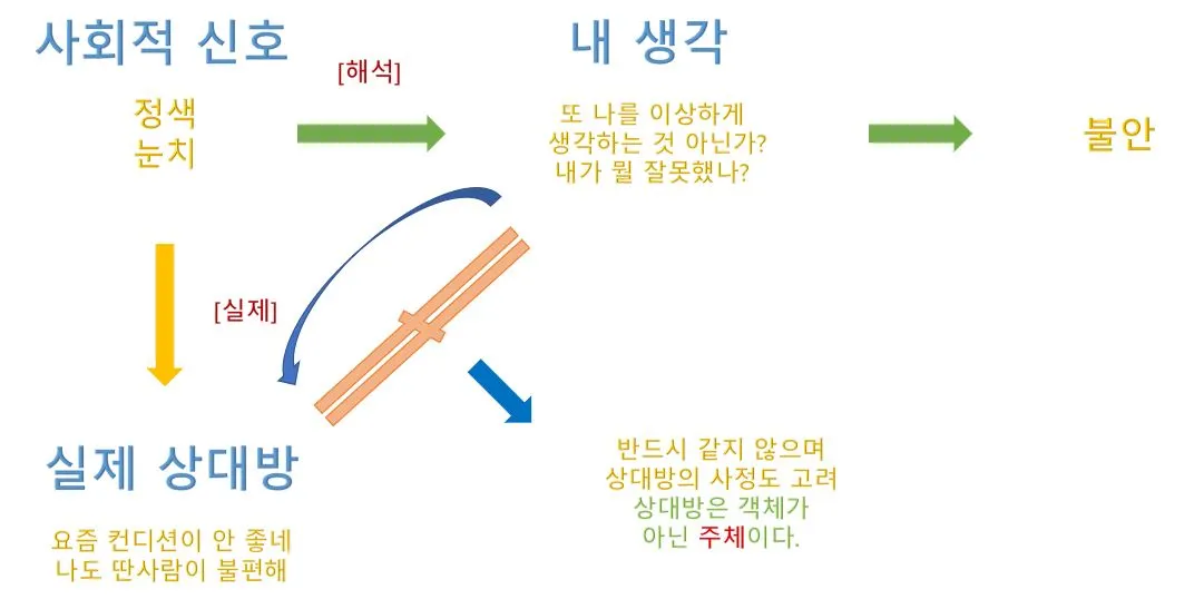 각자의 눈빛에서, 말 몇 마디에서 그 의도[사회적 의미]를 찾으려고 하고 쉽게 내 생각에 확신을 갖습니다. 주로 관계에서 상처가 많거나, 불안이 높은 경우 이렇게 쉬운 일반화를 합니다.