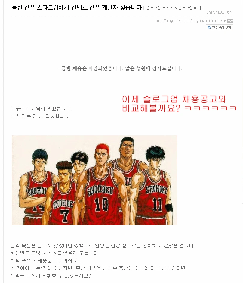 '북산' 이후로도 새 팀원이 필요할 때마다 우리의 특이한 채용공고는 계속되었다. 위 공고는 북산에 이은 두 번째 채용공고다.