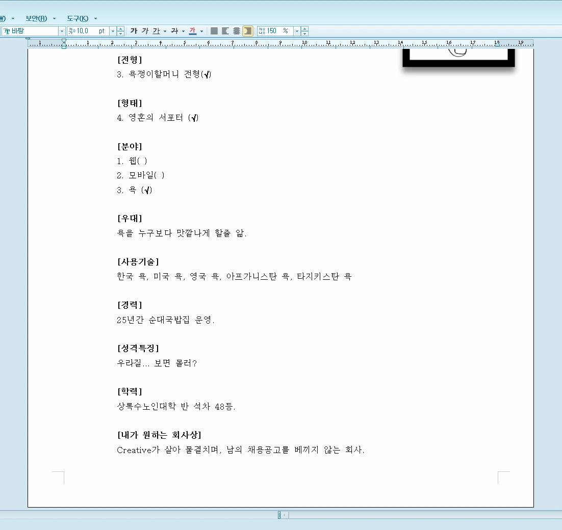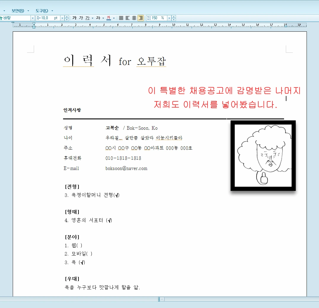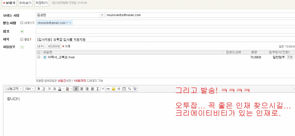 이렇게 보내면 뭐라도 답변이 올줄 알았는데 아무런 답도 받지 못했다. 그리고 저 회사는 저 공고를 아직까지도 쓰고 있다. 별 대단한 것도 아닌데 좀 쓰겠다고 메시지라도 하나 보내주셨으면 좋았을걸. 혹시 오투잡이 이 글을 보고 있다면 지금이라도 욕쟁이할머니의 당락 여부를 알려주시면 좋겠다.