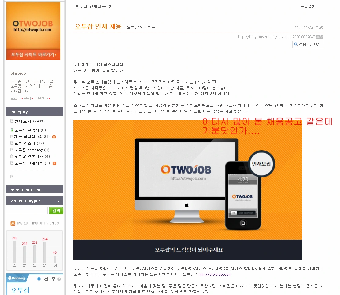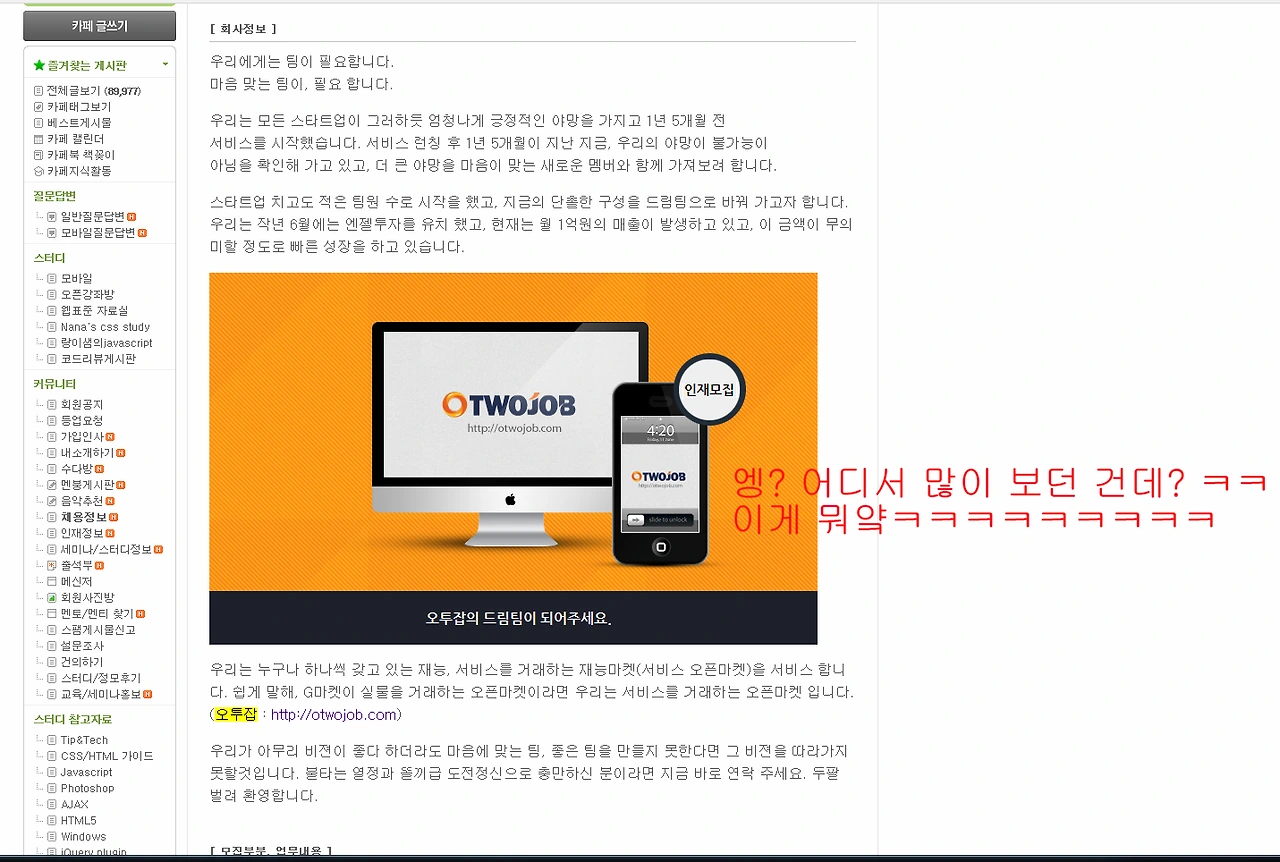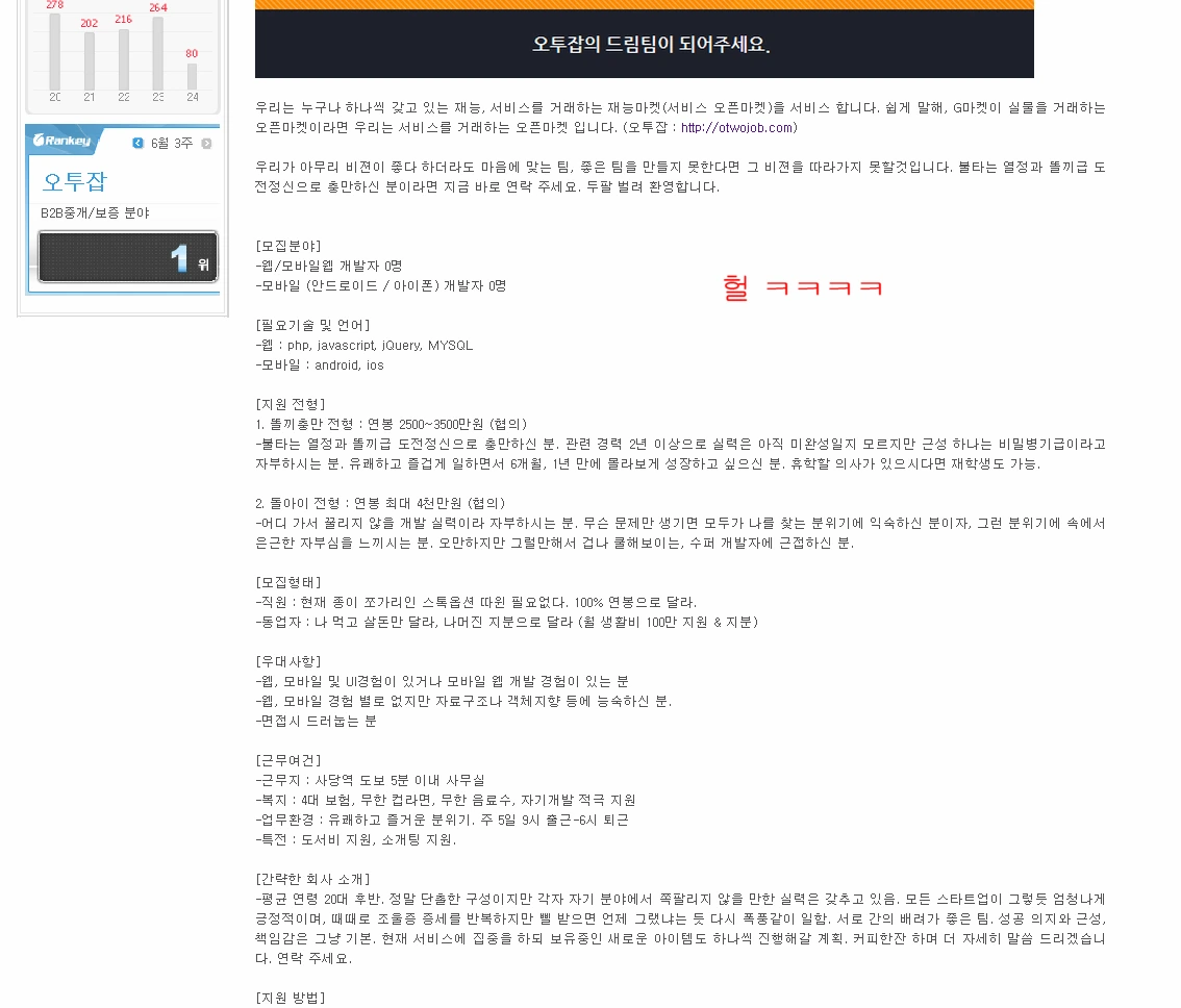 띠링. 누군가 페이스북 메시지를 보내왔다. 어떤 회사에서 우리 채용공고를 복사 붙여넣기해서 쓰고 있다고 말했다. 뭐지 싶어 들어가봤더니 정말이었다. 오투잡이라는 회사였고, 복사 붙여넣기였다. 우리도 그 회사에 이력서를 넣어보았다.