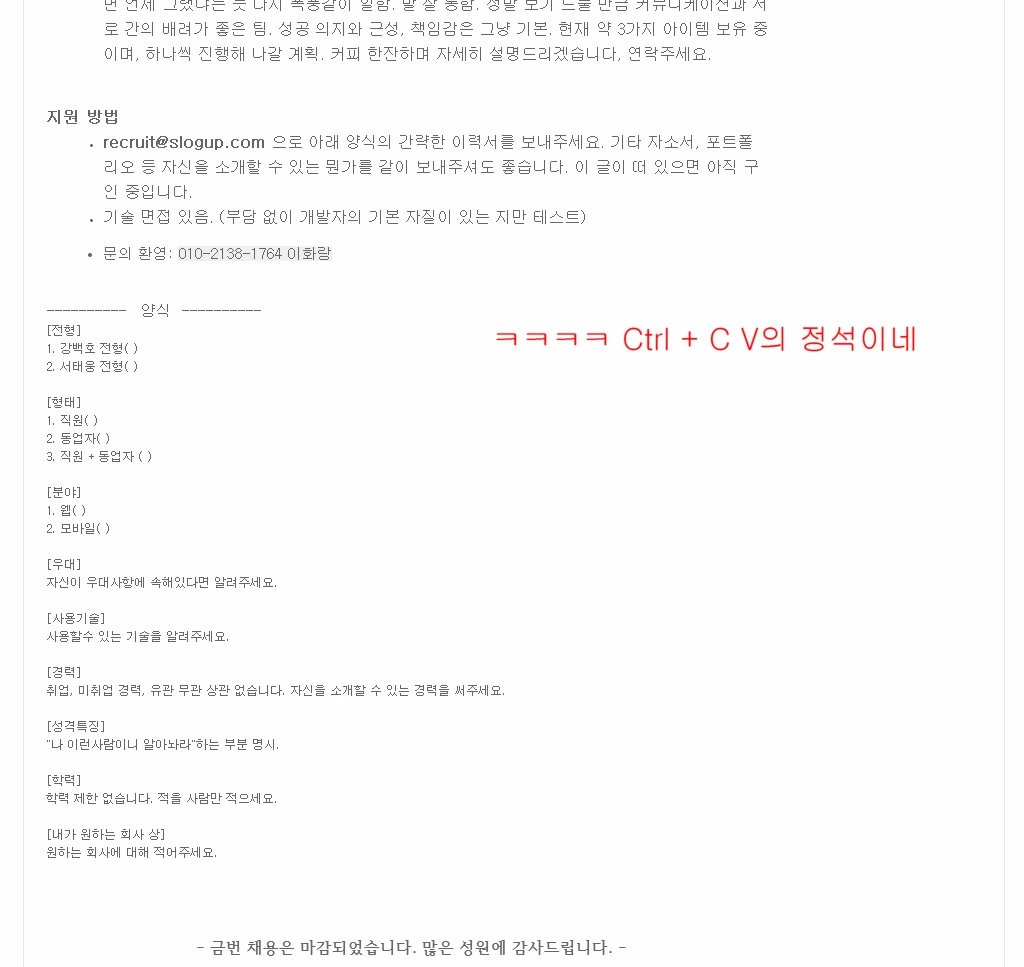 *저번화와 마찬가지로 위 공고는 현재 모집 중인 내용이 아닌 이전 채용공고의 복사-붙여넣기입니다. 이번에도 오해하시면 당신은 못 말리는 오해쟁이.
