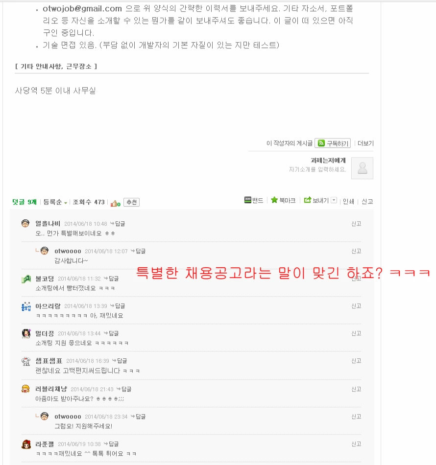 매번 이렇게 특이한 채용공고를 올리는 이유는 간단한다. 우리가 아직까지 쪼렙이기 때문이다. 가만있어도 수천 명씩 지원자가 몰리는 대기업이라면 이런 수고스러운 작업이 필요 없을 것이다. 하지만 우리같은 쪼렙 스타트업에서 좋은 사람을 뽑으려면 뭐라도 해야 한다. (돈 없고 백 없는 쪼렙 스타트업의 업무는 비단 채용뿐 아니라 다른 분야에서도 대부분 그러하다. 날로 먹을 수 있는 게 없다 흑흑)