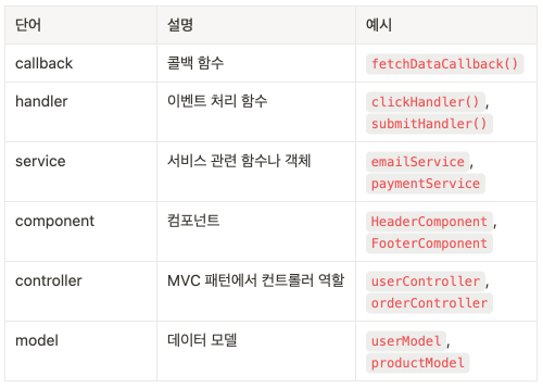 함수나 변수의 이름에 그들의 역할이나 디자인 패턴을 나타내는 용어를 포함하면 코드의 이해도와 유지 보수성이 크게 향상됩니다. 예를 들어, 콜백 함수를 정의할 때는 fetchDataCallback()처럼 이름에