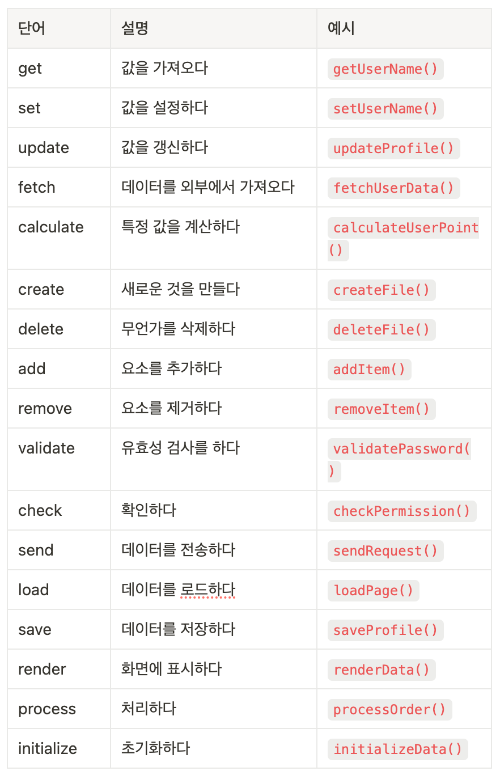 함수나 메서드는 특정 동작을 수행하기 때문에, 동사를 사용하면 그 기능을 명확하게 전달할 수 있습니다.
