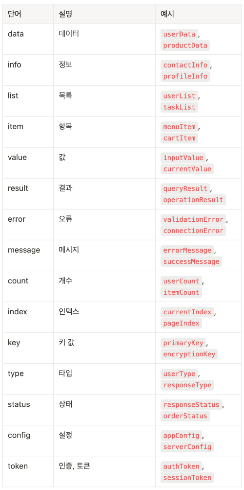 변수나 요소의 이름에 데이터 유형을 명시하는 명사를 포함하면 코드의 가독성이 크게 향상됩니다. 예를 들어, 사용자 정보를 저장하는 변수는 userData, 유저의 상태를 나타내는 변수는 userState와 같이 명사로 데이터의 종류를 나타낼 수 있습니다.