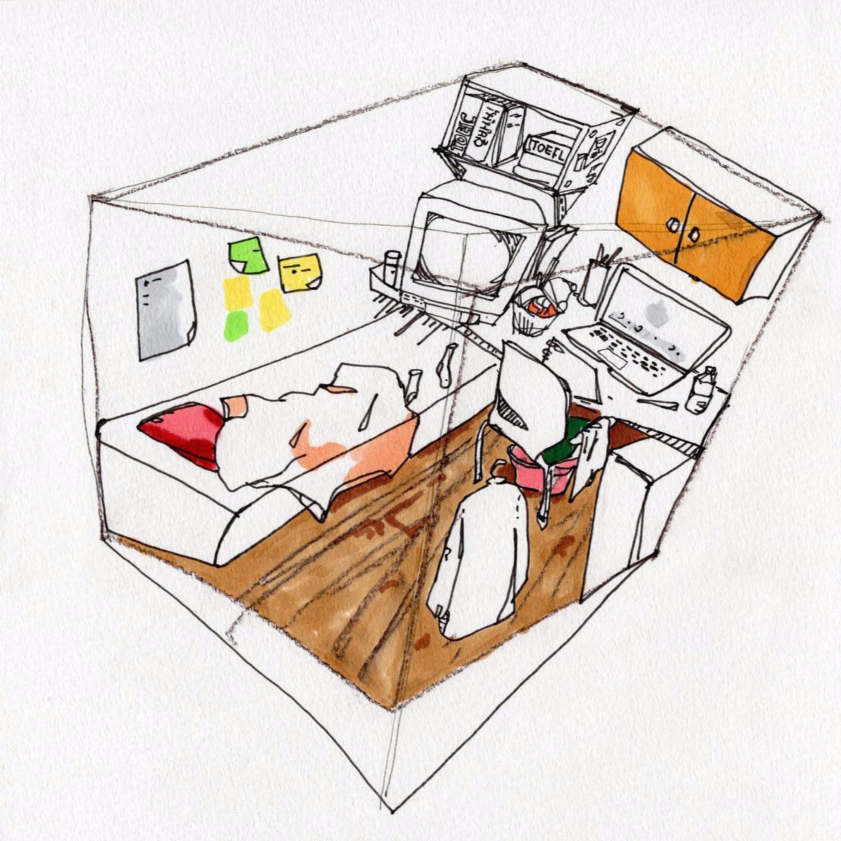 구겨진 양말이나, 벽에 붙어 있는 형광노랑,연두 포스트잇을 그리며 잠시 저 방에 앉아 있었다.