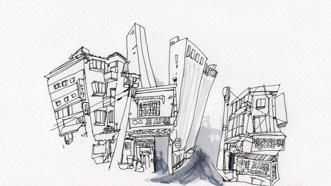 바쁜 도시인과 여든이 지난 노인 같은 서로 다른 건물들이 겹겹이 있다.