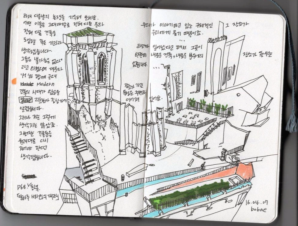 난 예술평론가도 아니고 특정분야의 전문가도 아니다. 건축가는 어지러운 많은 일을 바로잡는 역할을 하는 것 같은데 그렇다면 더더욱 난 건축가가 아니고, 그저 서로 맞물려 있는 공간을 주의 깊게 여행하는 사람일 뿐이다. P9