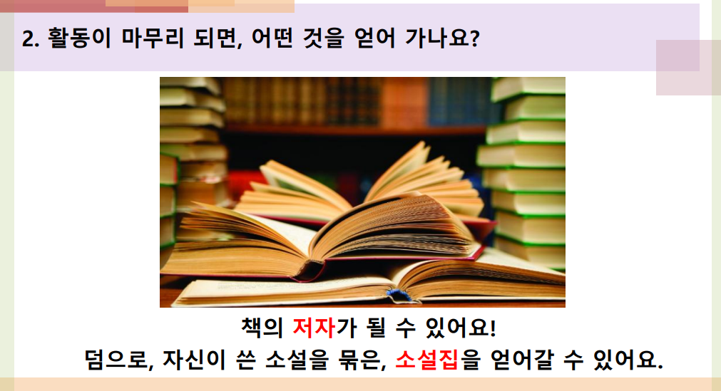 이야기 창작반의 홍보자료에서 자신이 쓴 글이 책으로 만들어질 수 있다는 소개와 내가 워낙 책을 보는 것을 즐기기도 하고, 예전에 책을 만들게 된다면 쓸 수 있는 간단한 구성을 생각했기 때문에.