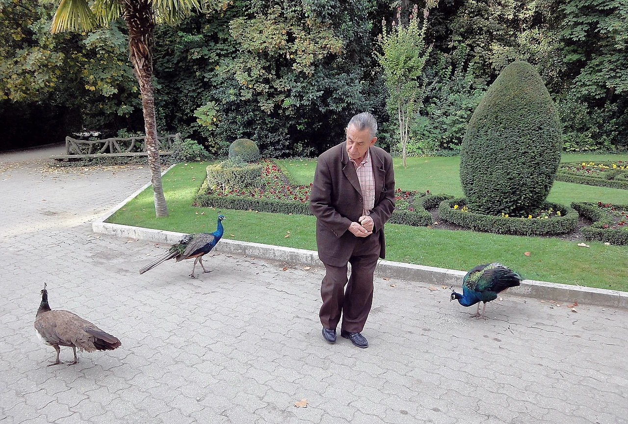 공작은 먼 산을 지그시 바라보며 상념에 잠겼다. 그 모습이 마치 과거의 영광을 그리워하며 신세를 한탄하는 한물 간 연예인 같다. 날개를 펴지도 않고 폴짝 등받이에서 벤치로 뛰어내려 자기 발을 쳐다보며 말한다.