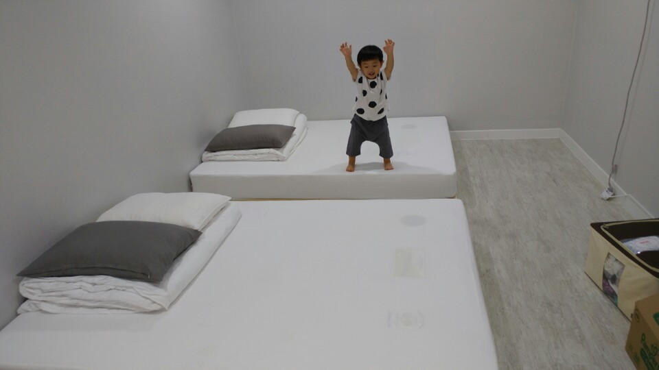 침대는 프레임이 낮아서 아이랑 지내기에 참 좋습니다~ 두 개 붙여놓고 쓰는데 아이가 너무 좋아서 매일 데굴데굴 구르고, 뛰고 있어서 걱정입니다^^;;
