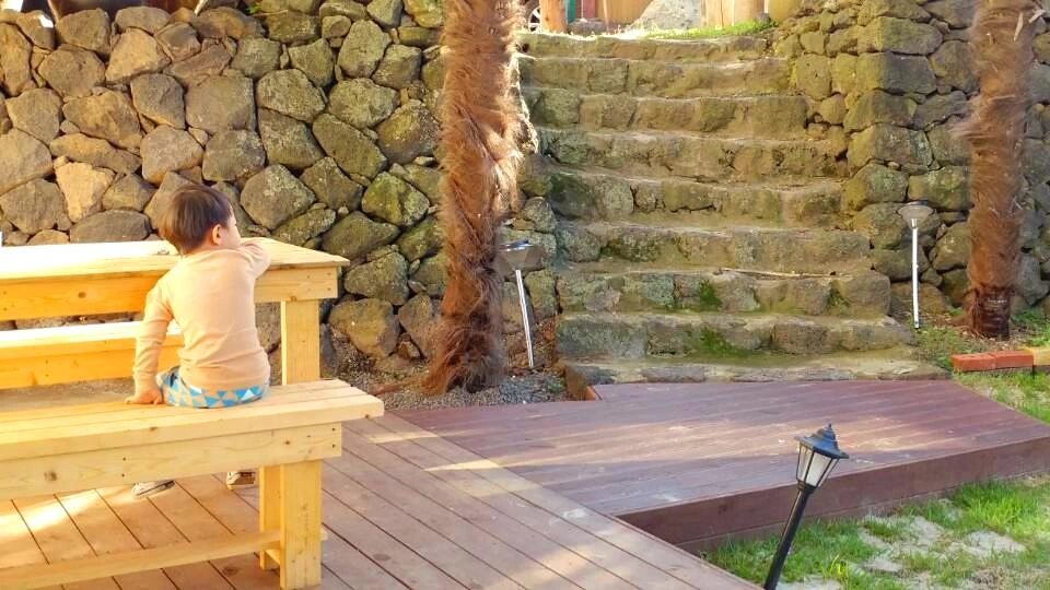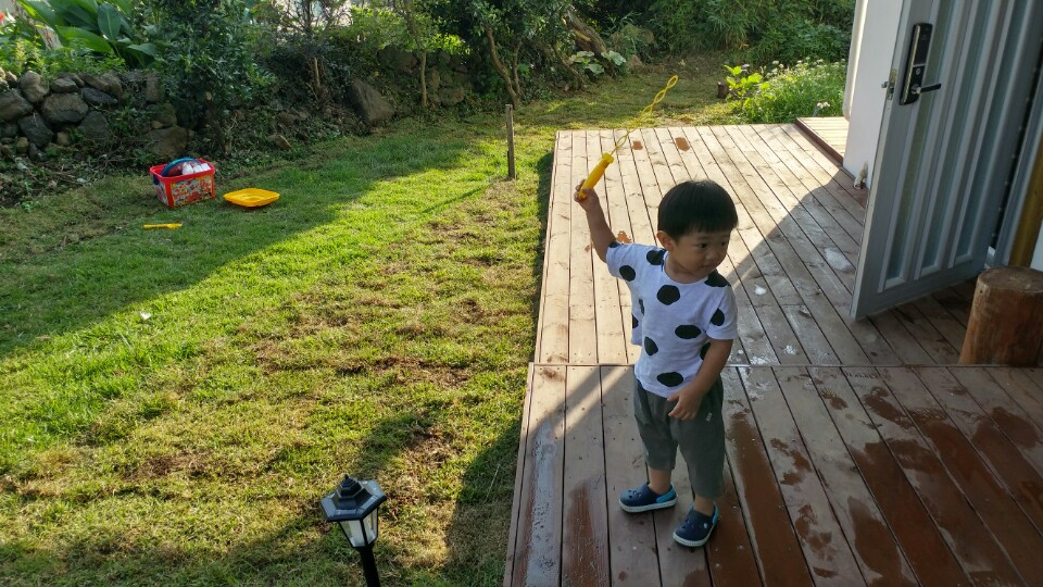 마당이 있다는 게 아이에게 이렇게 좋을지 몰랐네요. 비눗방울 날리고, 밥도 먹고, 옆집 멍멍이에게 인사도 하고, 귤나무와 풀도 만져보고. 윗집 이모랑 형누나가 이뻐해 주니 툭하면 위층으로 올라갈 정도입니다.^^;;