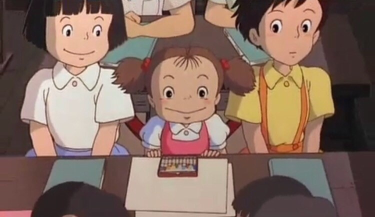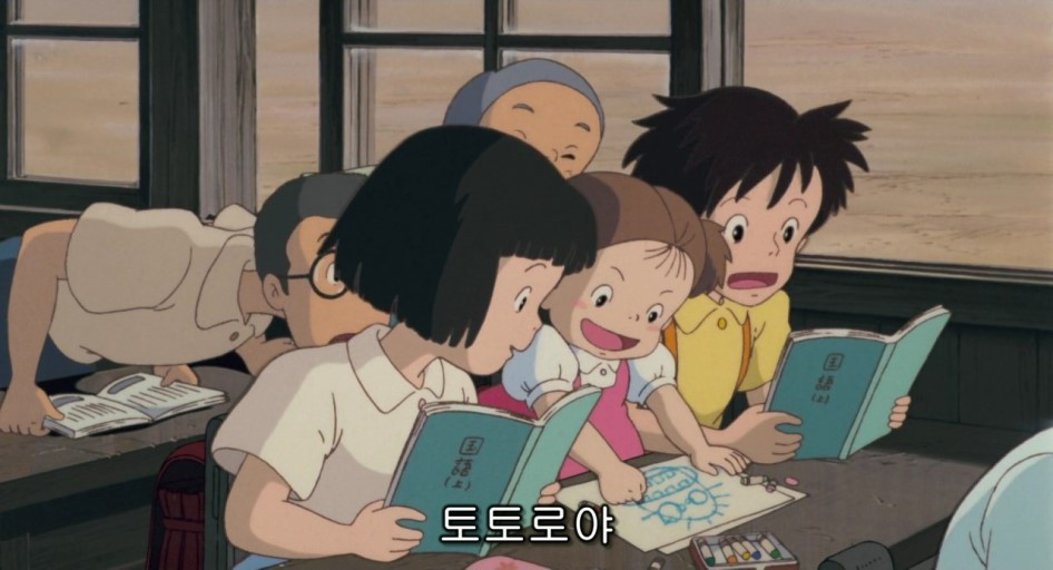 <이웃집 토토로>를 보면 언니 사츠키의 학교에 기필코 찾아간 메이가 언니의 짝꿍 사이에 앉아 그림을 그리며 목청껏 자신의 이야기를 하는 장면이 나온다.