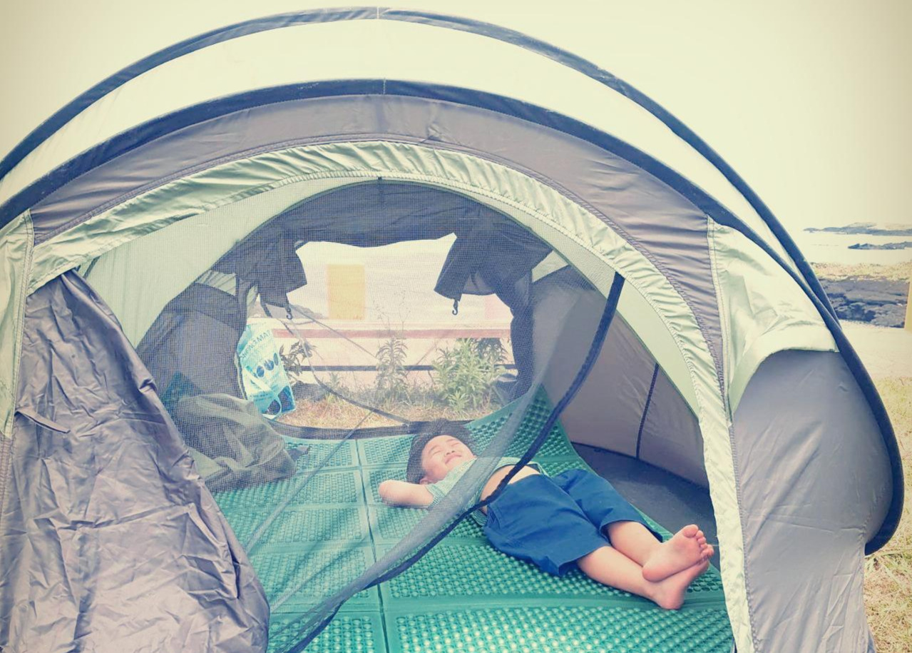 아빠와 신나게 다슬기를 잡는다. 아이는 한참을 놀고서야 이제 춥다고 한다. 데워진 텐트 안으로 들어가서 팔을 뒤로 괴고는 다리까지 꼬고 누웠다. 세상 편해 보이는 아이의 모습에 엄마 미소가 절로 피어오른다.