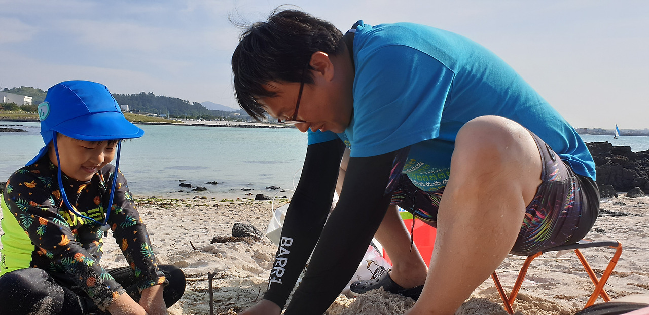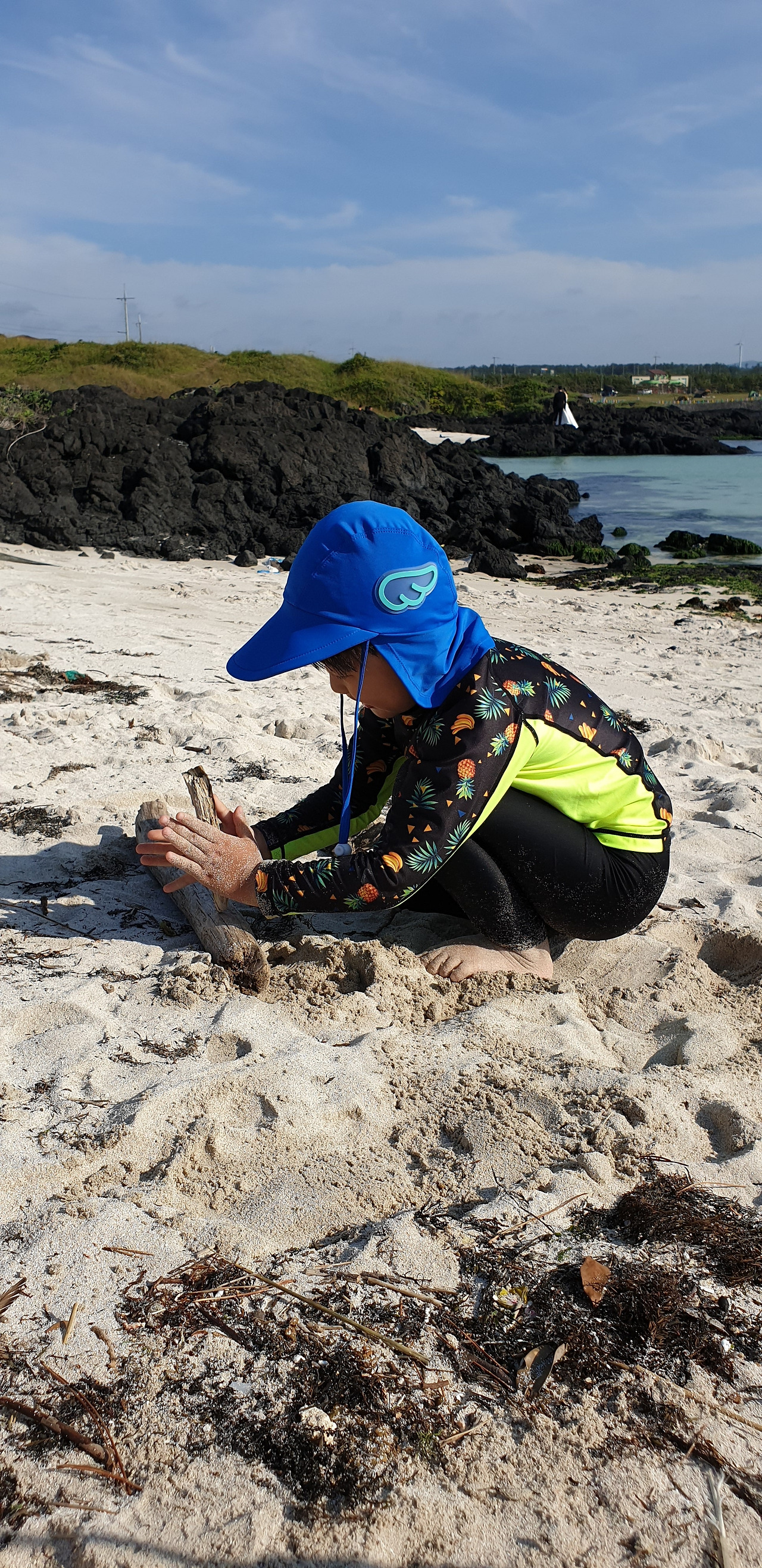 모래놀이와 물놀이를 반복한다. 태풍으로 밀려온 해조류가 둥둥 떠다닌다. 태양이 작렬하고 다리와 뒷목이 따가워온다. 선크림도 바르지 않았는데. 제주 살 자격이 없는 것 같다.