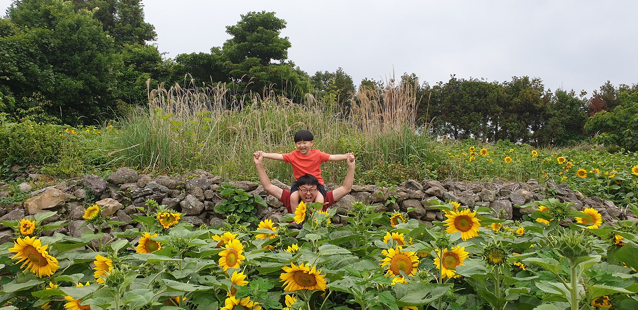 서둘러 출발을 했고 가는 길에 항몽유적지에 들렀다. 기대 없이 찾았던 그곳은 예쁜 해바라기 꽃이 만발한 작은 밭이 있었고 근처에서는 마을행사로 플리마켓과 먹거리 등이 차려져 있었다. 투호, 굴렁쇠 굴리기 등 전통놀이를 해볼 수 있었고, 쑥개떡을 만들어 쪄주기도 했다. 이런 횡재라니. 다시금 제주가 좋아지는 대목이다.