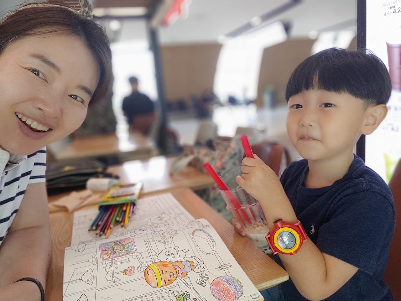 아이를 동반하면 셀프체크인 서비스가 제한이 된다. 아무래도 유괴 등의 위험에서 보호하려는 목적이겠거니 싶어 불편해도 늘 수속 카운터를 찾는다. 체크인을 하고도 시간이 남는다. 늘 빠듯하게 도착하던 금요일 저녁 시간을 생각해서 출발했더니 이번엔 여유롭다. 이럴 때를 대비하여 가방에 컬러링북과 색연필을 준비해왔다. 게이트 근처의 카페에서 큰 사이즈의 음료를 주문하고 마주 보고 앉아 함께 색칠을 시작한다. 이런 우리의 모습이 어디선가 본 듯한 기시감이 밀려왔는데 나도 모르게 괜히 뿌듯했다. 아들과 데이트를 꿈꾸는 엄마의 바람 연장선이다.