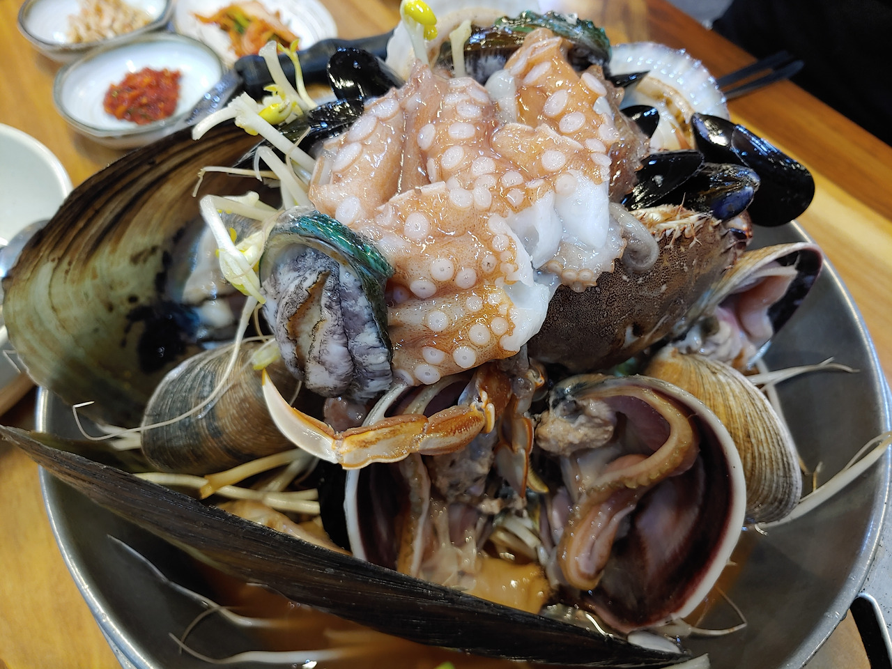 죽을 즐겨먹지 않는 아이인데, 집 근처의 보말죽은 아주 잘 먹는다. 하지만, 우리 부부도 배가 고팠던 터라 공항 가까운 곳에서 허기를 면하기로 한다. 유명한 해물탕 집인데 중국인들이 많이 찾는 곳인 듯 보인다. 홀 안의 3/2가 중국인이고 주문을 받는 직원조차도 한국말로 주문을 하면 제대로 주문을 받은 것인지 미심쩍은 마음이 들 정도이다. 아이에게는 미안하지만 핸드폰을 쥐어준다. 기내에서 잘 참은 대가이기도 하다.
