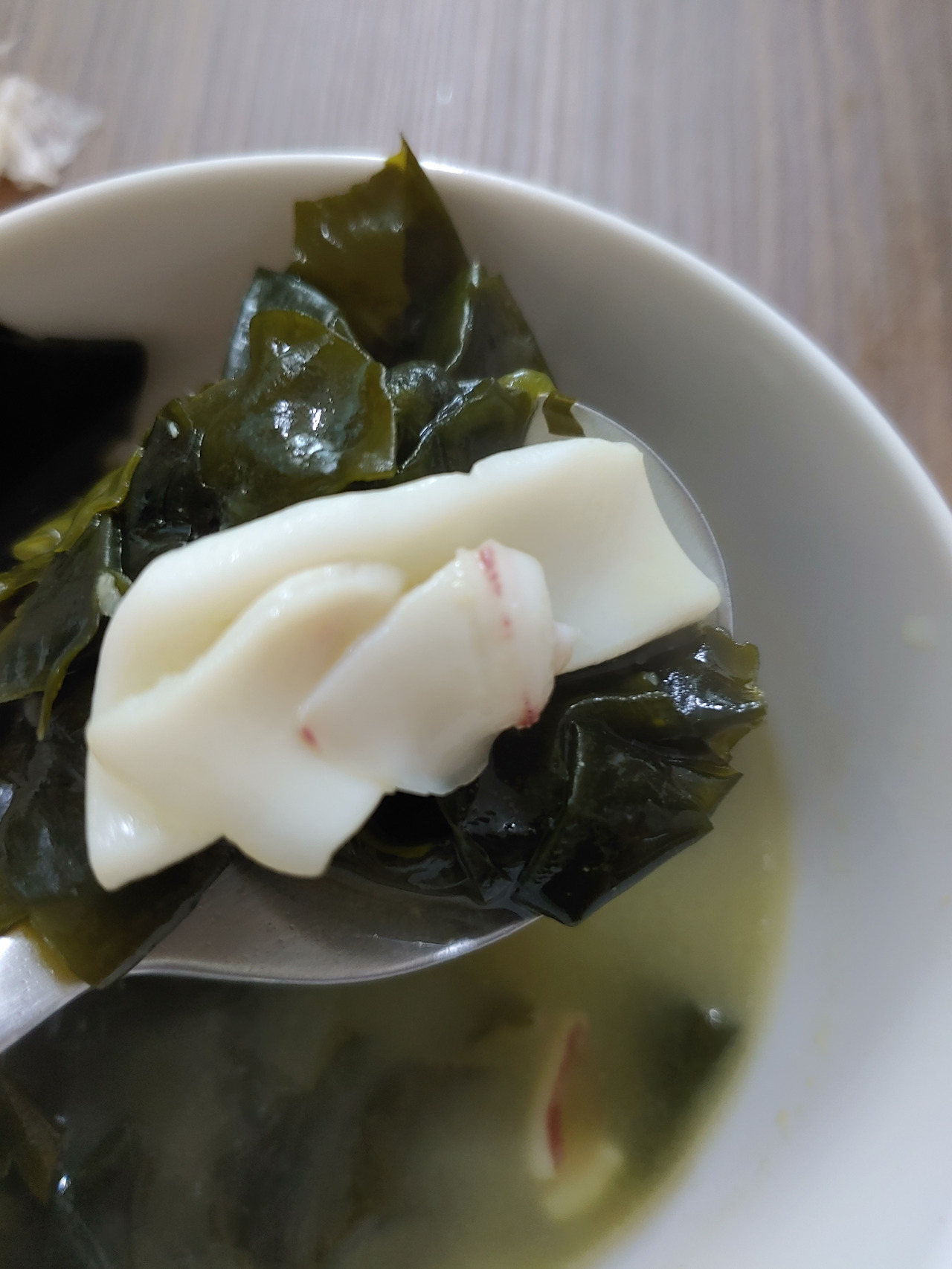 쌀을 씻고 뜬 물을 받아둡니다. 미역국에 꼭 필요한 물이니 잘 챙겨둬야 해요. 밥을 안치는 동안 남편은 미역국을 준비합니다. 남편의 생일을 제외하고 미역국 담당은 늘 남편이에요. 가끔 과한 욕심을 부리다 실패할 때도 있지만 대부분은 맛이 정말 좋습니다. 음식에 이런저런 시도를 하는 것을 좋아해서 각종 미역국이 탄생해요. 오늘은 어제 예고한 대로 '한치 미역국'입니다. 어디에 찾아봐도 레시피가 없어요.