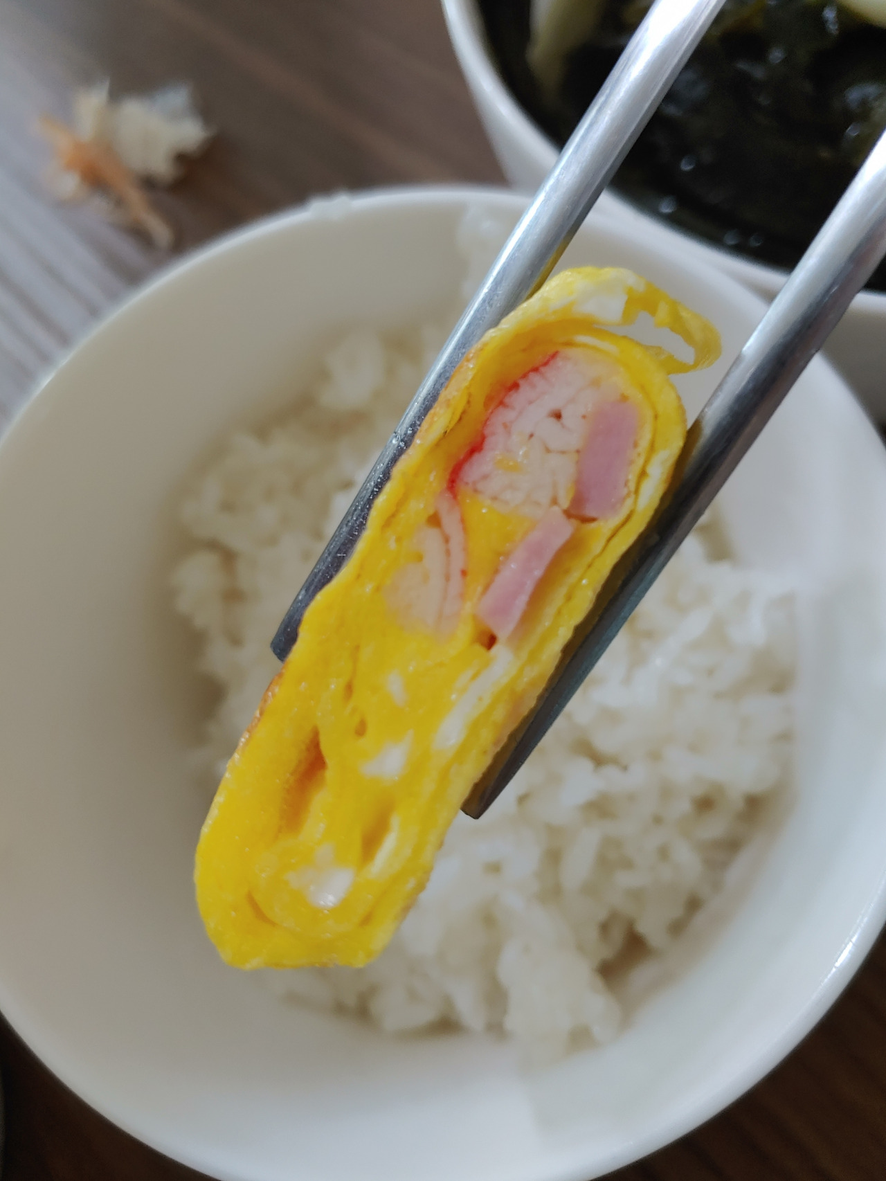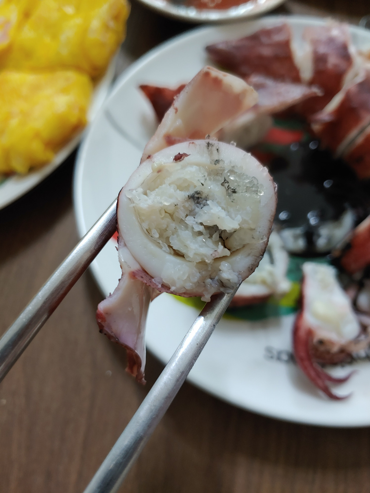 한치 미역국 생각보다 국물 맛이 좋네요. 야들야들한 한치의 식감이 꽤 괜찮습니다. 이번엔 한치 통찜을 먹어봅니다. 알이 잔뜩 들어있고요, 먹물도 그대로 익었습니다. 고소한 맛이 일품이네요. 아이에게도 먹물 한치를 맛보입니다. 영구처럼 웃어보라고 시키니 저도 재밌는지 씩, 웃어 보입니다. 계란말이와 호박전, 햄 부침, 고등어구이는 모두 익히 알던 맛이고요. 다만, 제주에서 다 같이 푸짐하게 먹은 첫 아침상이라 한 그릇 뚝딱 했어요. 모두 아들 덕분이지요. 아니 남편 덕도 있네요. 오늘의 하이라이트는 한치였으니까요. 어제 조금만 놀리길 참 잘한 것 같아요.