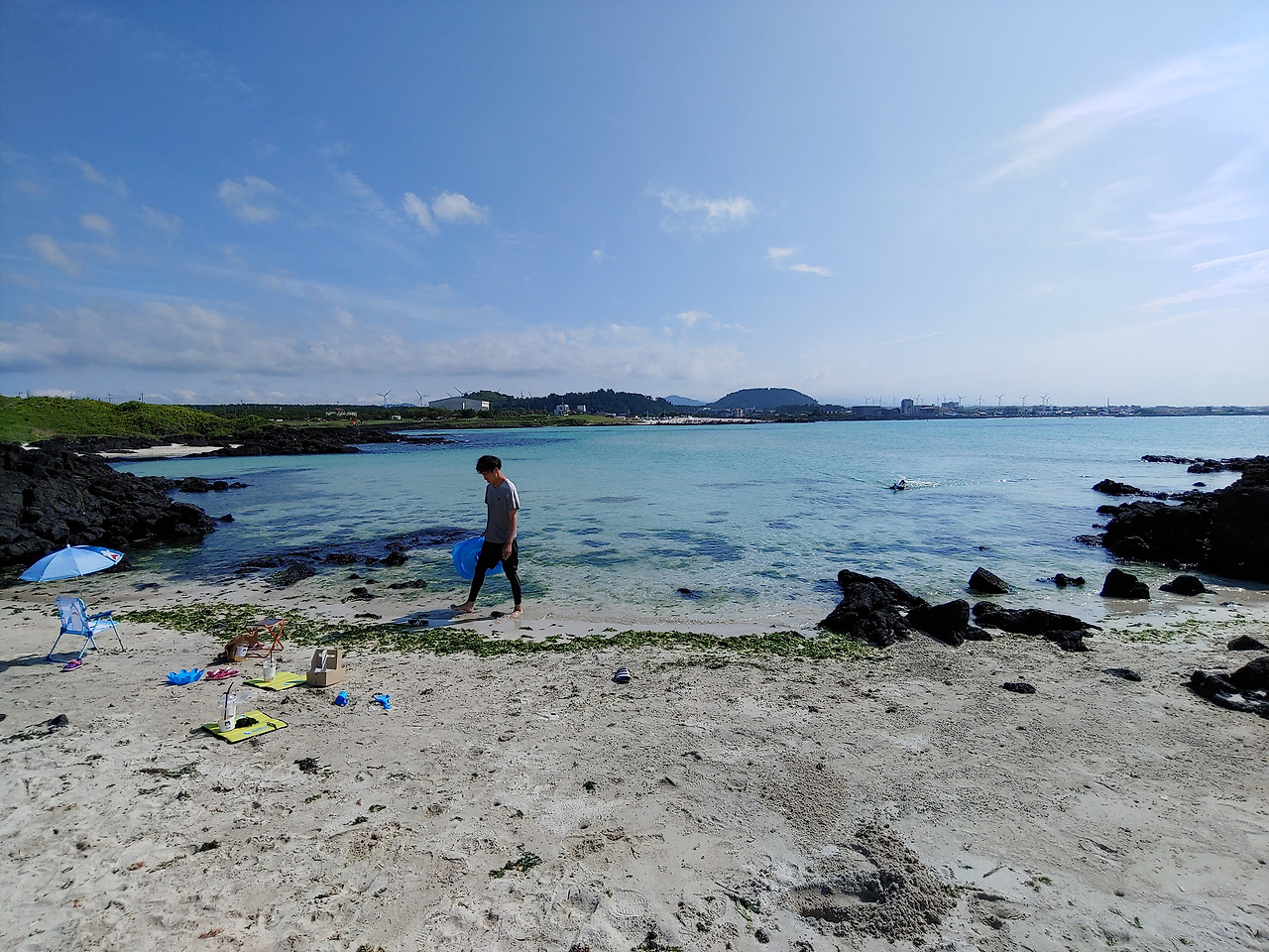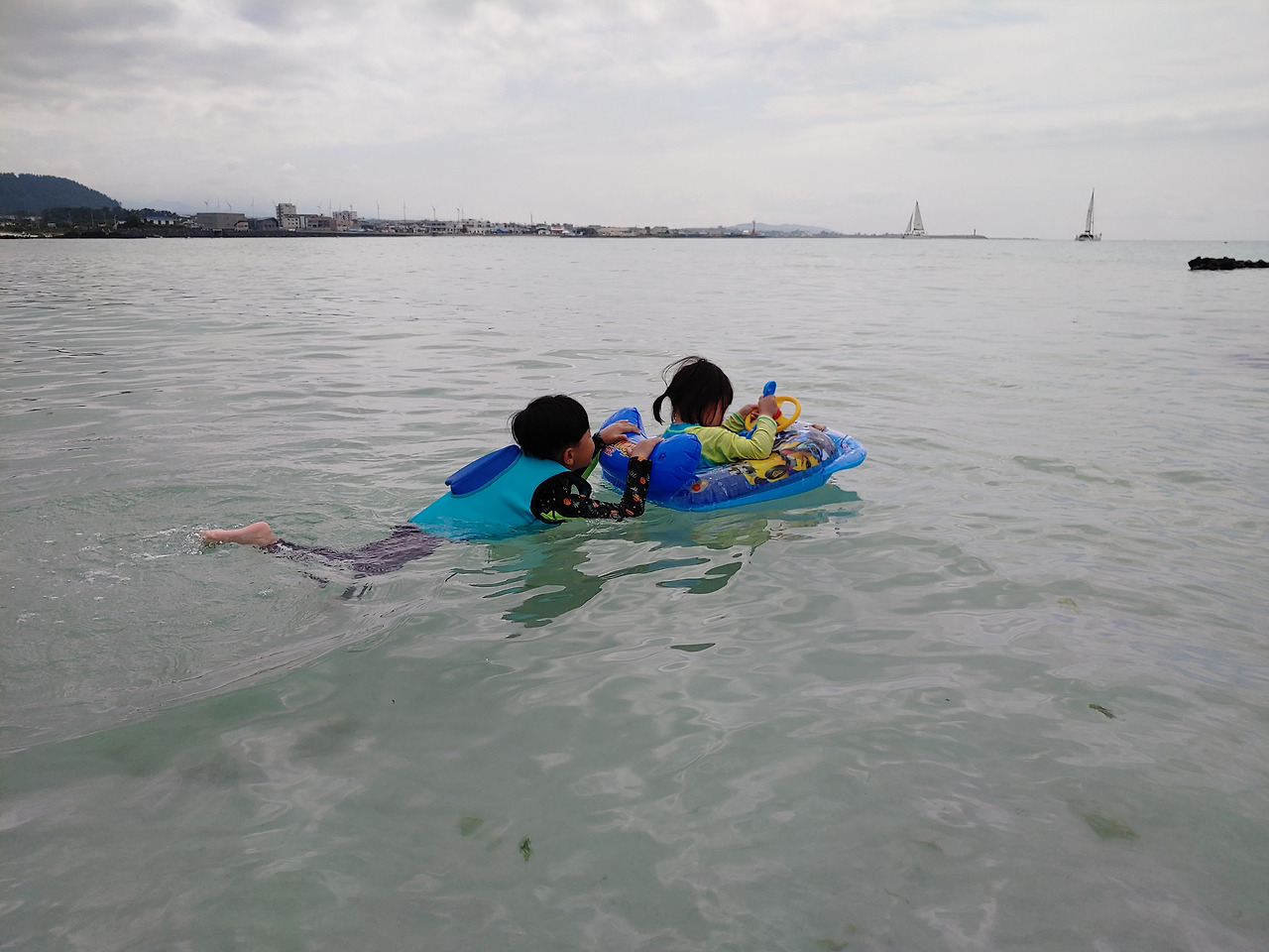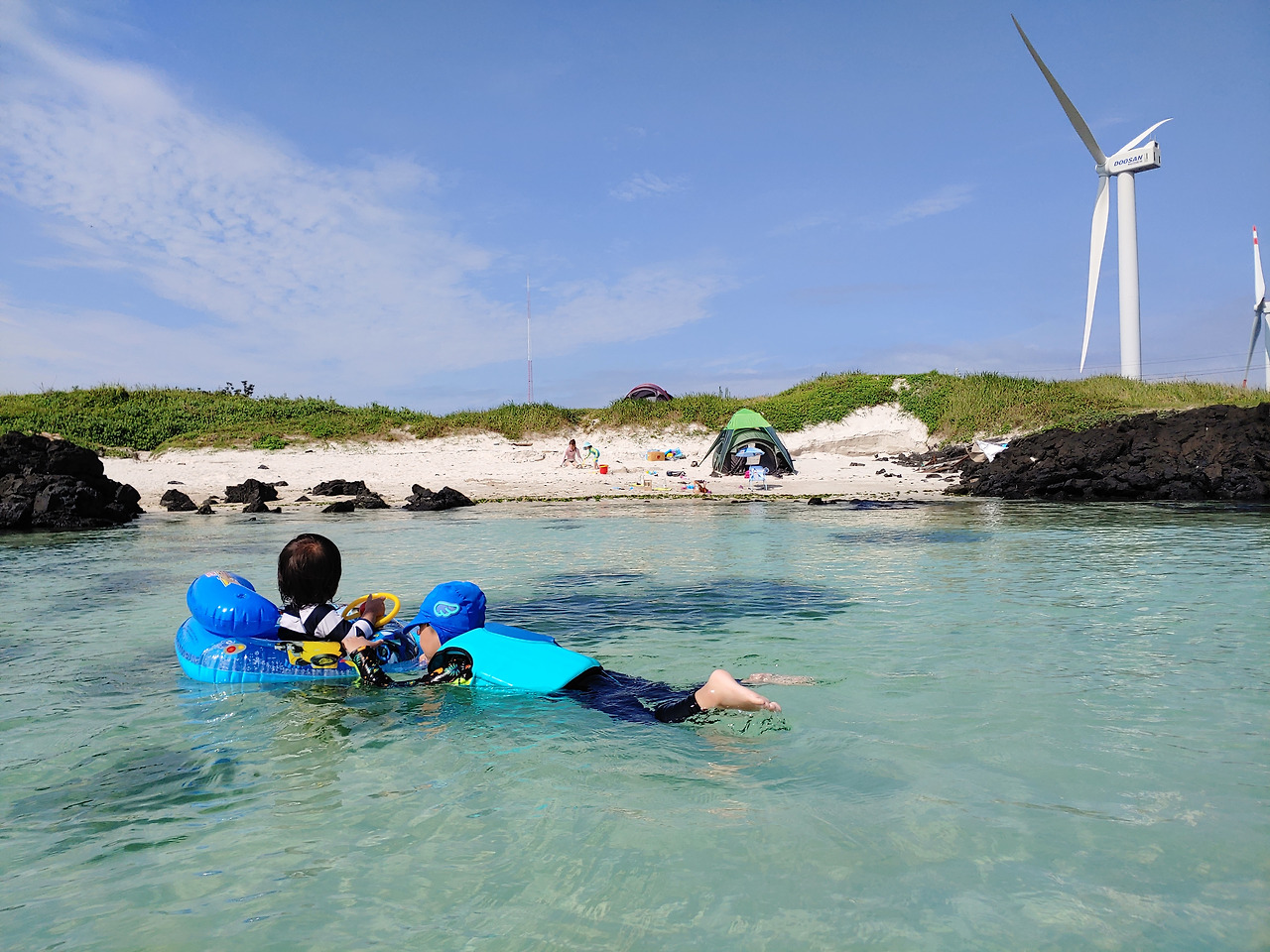김녕 프라이빗 해변으로 출발합니다. 관광객들은 해수욕장에서 놀지만, 우리는 우리만의 해변이 있거든요. 아는 사람들만 가는 곳이요. 아무도 없는 비치에 텐트를 치고 그늘막 아래 매트도 깔아 둡니다. 아이스박스와 아이들 모래놀이 장난감을 꺼내놓으니 모두 준비가 끝났습니다. 이제 물에 들어가기만 하면 되지요.