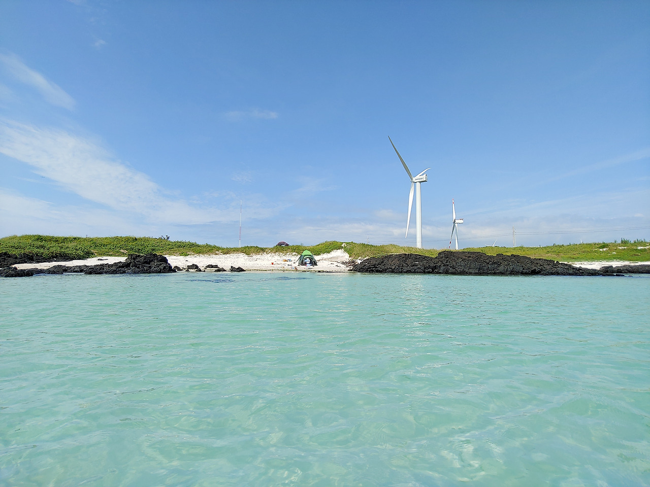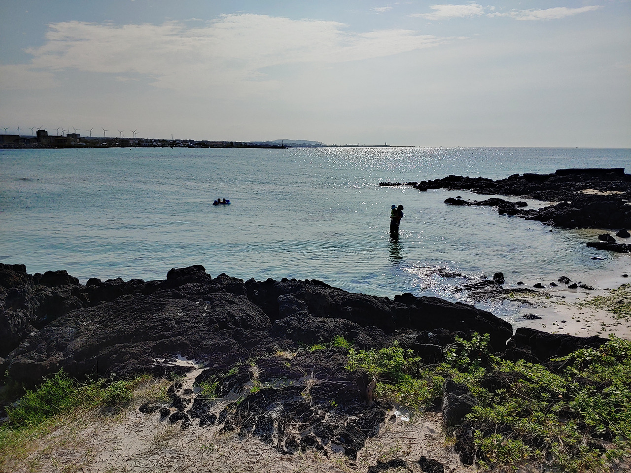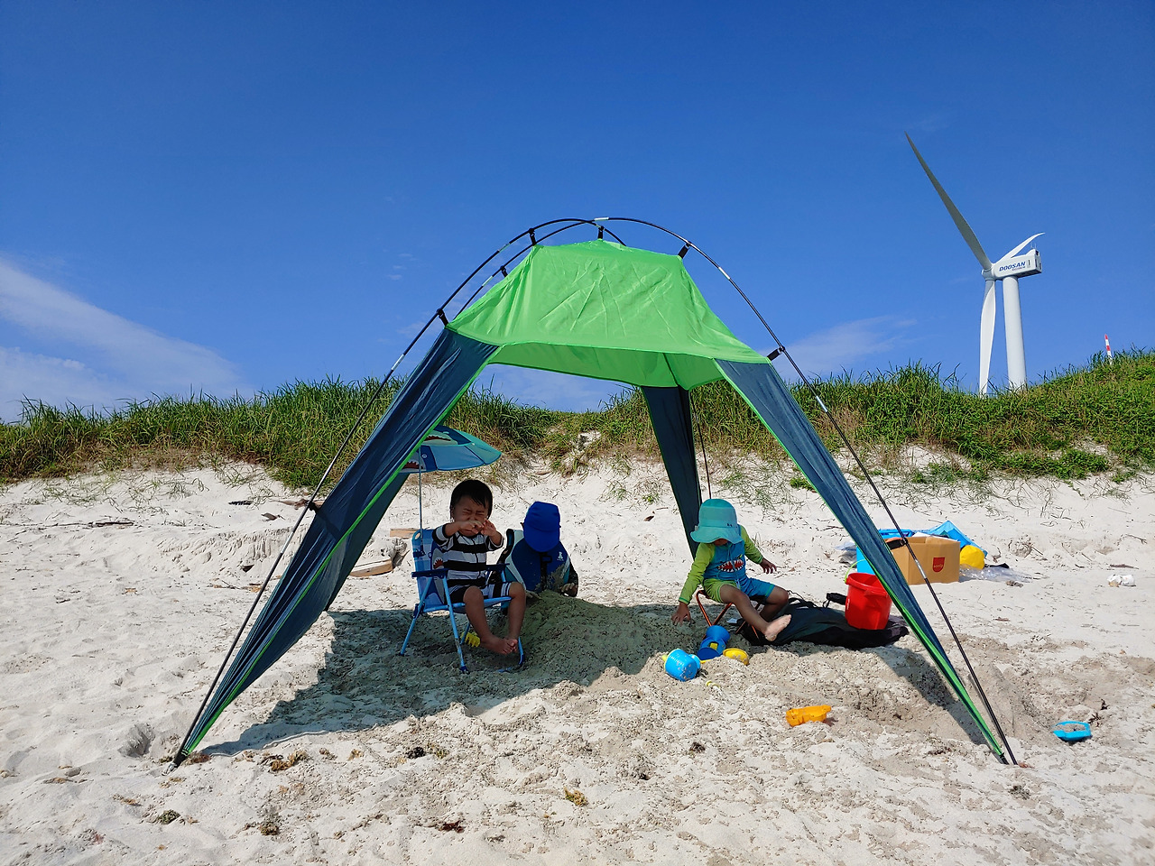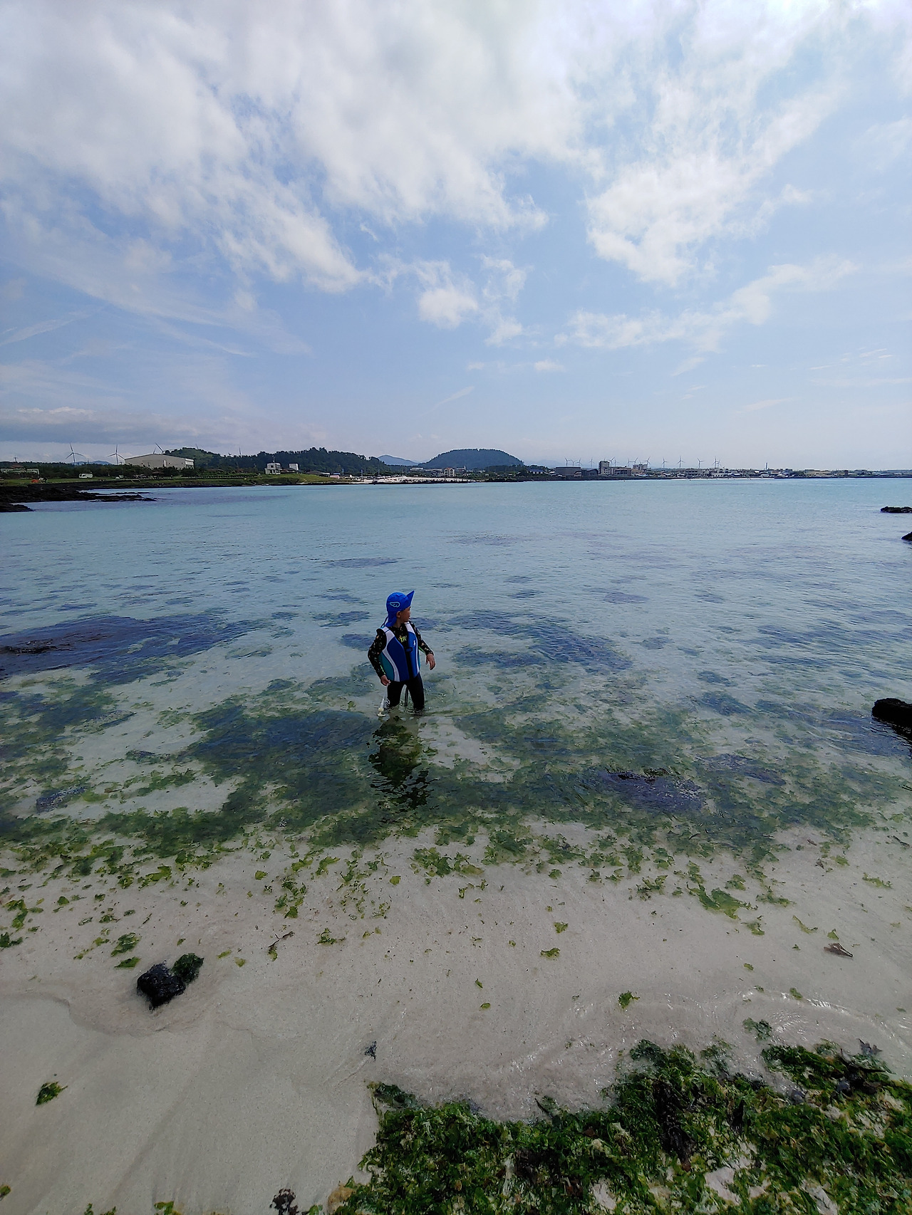 김녕 프라이빗 해변으로 출발합니다. 관광객들은 해수욕장에서 놀지만, 우리는 우리만의 해변이 있거든요. 아는 사람들만 가는 곳이요. 아무도 없는 비치에 텐트를 치고 그늘막 아래 매트도 깔아 둡니다. 아이스박스와 아이들 모래놀이 장난감을 꺼내놓으니 모두 준비가 끝났습니다. 이제 물에 들어가기만 하면 되지요.