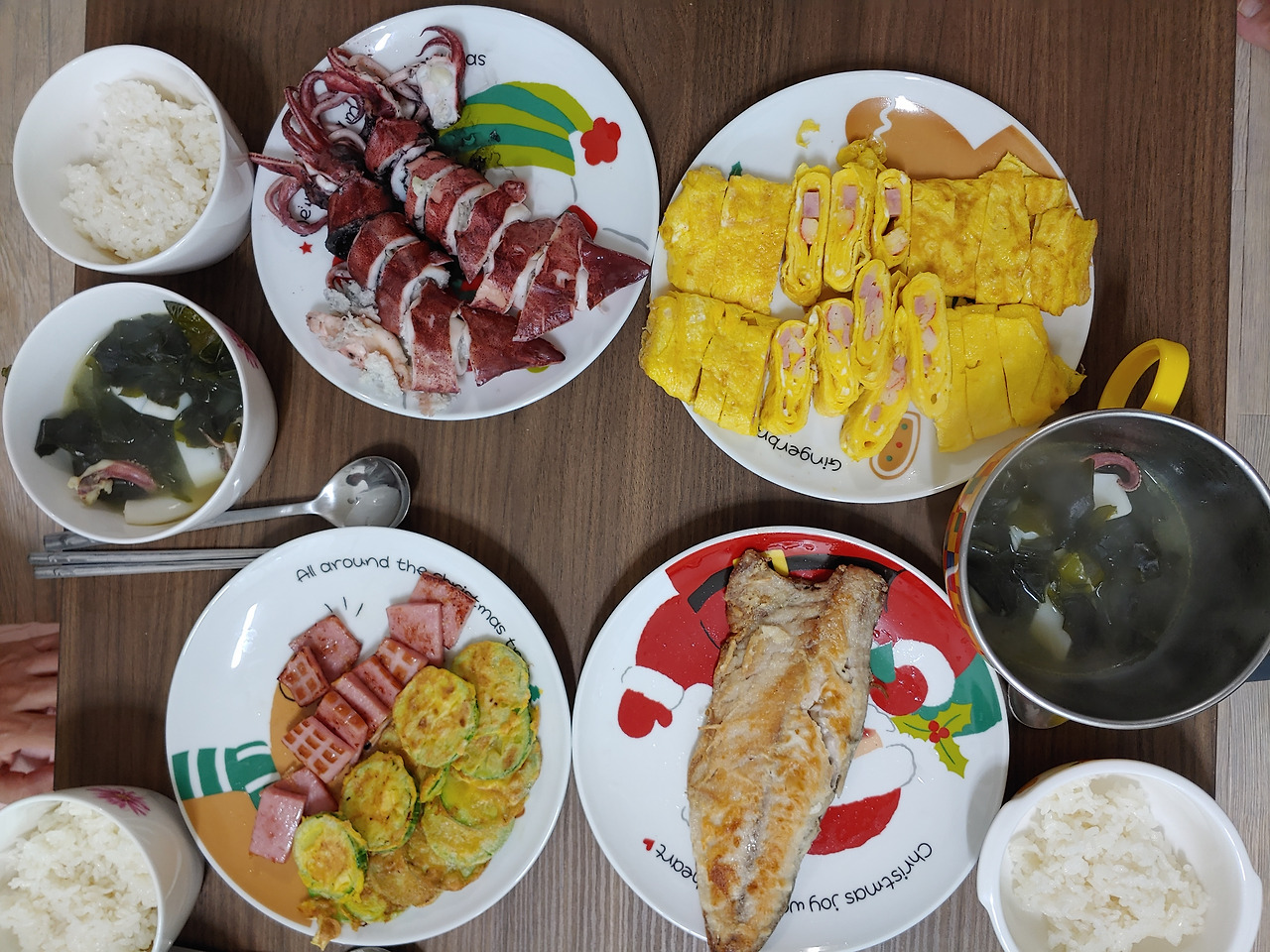 저는 맛살과 햄을 넣은 계란말이를 합니다. 제일 만만하지요. 아이들 반찬으로. 남편은 미역국을 불에 올리더니 이번에는 한치 통찜을 합니다. 어디선가 들었는데 한치는 겉만 슬쩍 물로 닦고 내장과 함께 쪄내도 괜찮다고 했어요. 싱싱한 녀석이라 내장도 함께 먹어도 된다고요. 기대를 해봅니다. 이번에는 호박전을 부칩니다. 야채를 싫어하는 아이인데 호박전은 다행히 잘 먹어요. 햄과 생선도 굽고요. 반찬이 얼추 완성되어 가니 상을 차려봅니다.