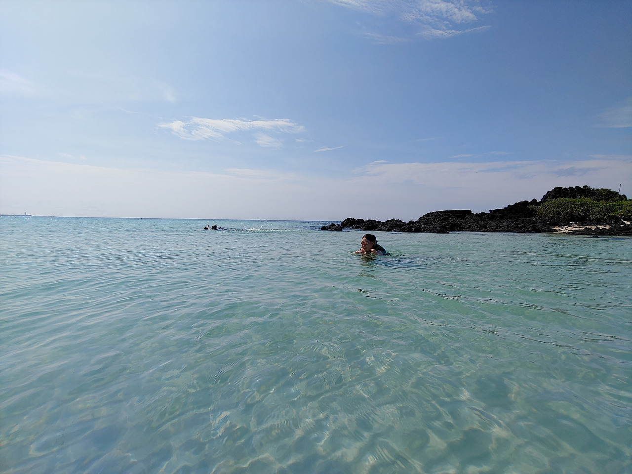 물은 적당한 높이에 적당한 온도네요. 다행입니다. 거침없이 들어갑니다. 오늘은 구름이 많은 날씨라 가끔씩 해가 얼굴을 보일 때 예쁜 바다색을 보여줍니다. 스노클링도 하고 튜브도 타고. 천국에 가면 이런 기분일까요.