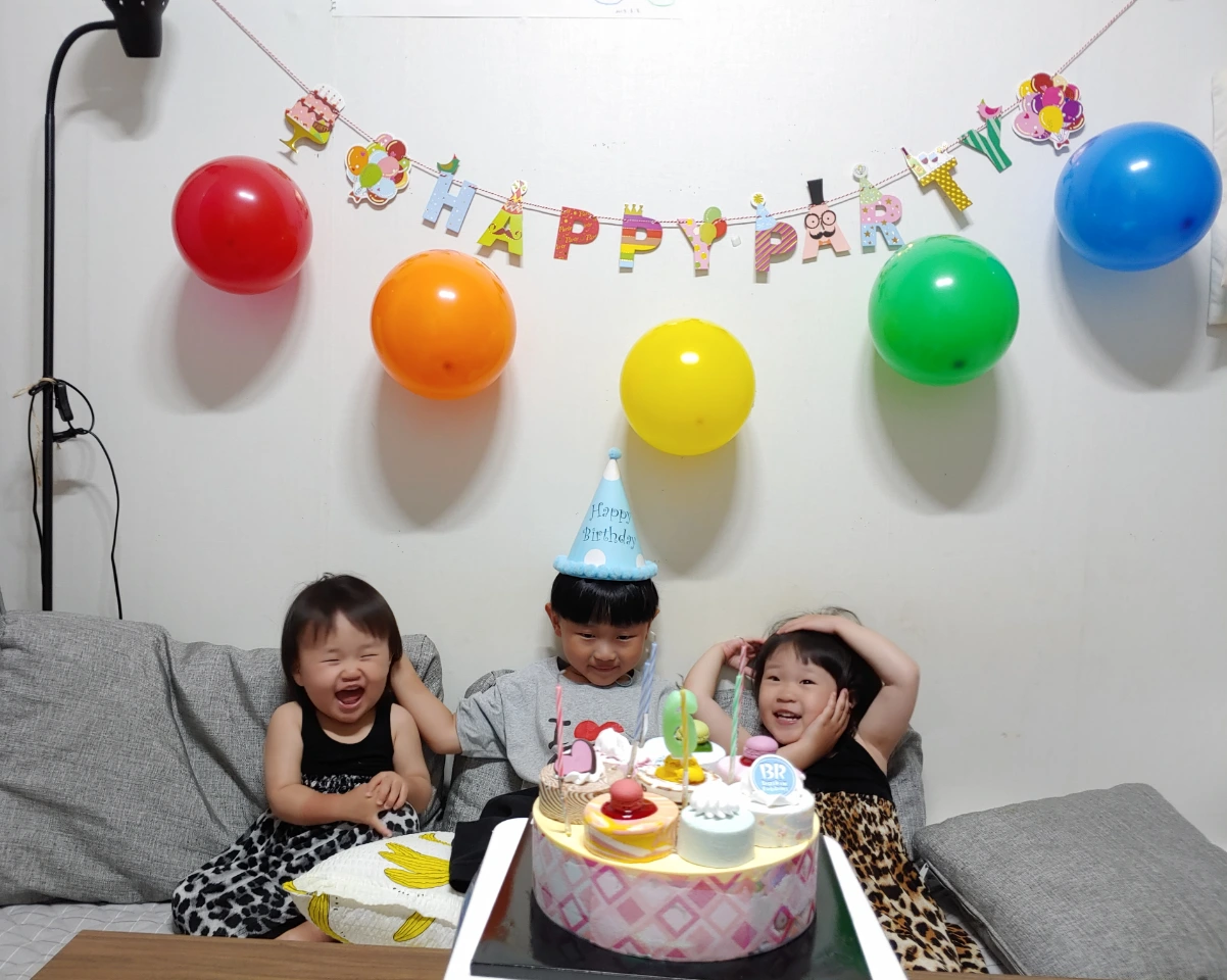 이번 생일에는 아이가 꼭 원했던 파티의 모양이 있었어요. 작년까지만 해도 파티보다는 생일선물에 관심이 있던 아이인데, 사회생활을 하더니 보는 눈이 생겨났나 봅니다. 아무튼, 아이가 원하는 파티는 우선 깜짝 파티가 아닐 것, 그리고 세모 모양 가랜드가 있을 것. 이 두 가지였어요. 가랜드의 모양은 지킬 수 없었지만 아이가 그리는 파티의 모양이 대강 이런 것이겠구나 상상하며 꾸몄습니다. 간단하지만 효과는 엄청났죠. 게다가 동생들까지 축하해주니 얼마나 기쁠까요.