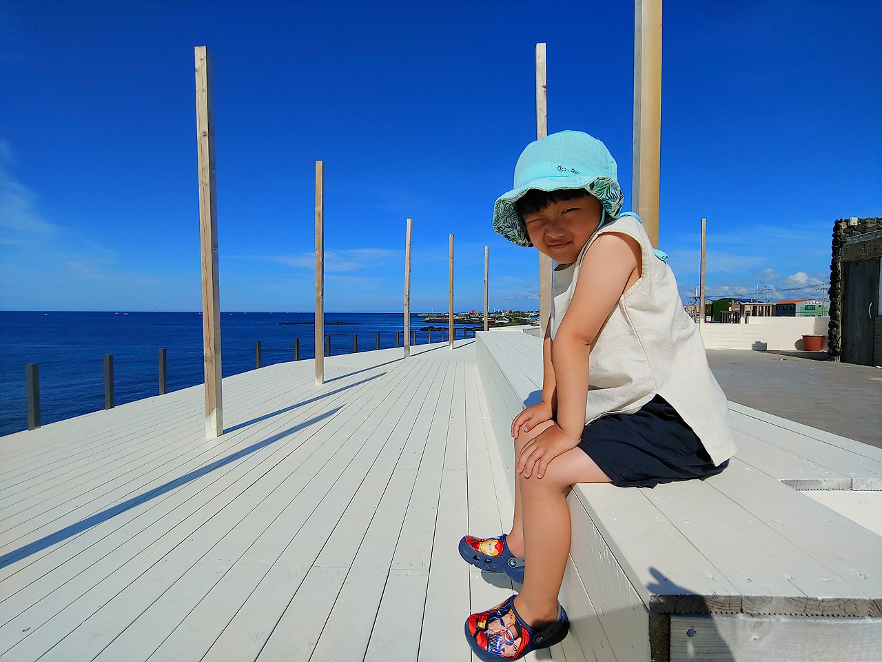쓰린 속을 달래기에는 술이 제격이지만, 아이가 있고 드라이브 중이니 그러기가 어려우니까요. 차가운 커피라도 들어가야 마음이 달래질 것 같아서 던진 말에 남편도 같은 생각인지 바로 동의를 합니다. 바다가 보이는 카페로 들어섭니다. 그 사이 아이는 잠이 들었고요. 의자를 두 개 붙이고 거기에 뉘이니 콜콜 잘 자네요.