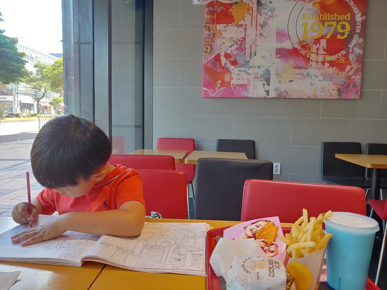잘 기다린 아이가 배가 고프대요. 저도요. 긴장이 돼서 제대로 식사를 못했거든요. 1층에 내려오니 또 롯데리아가 보여요. 오늘도 가자해요. 저는 뭐든 좋아요. 운동 안 하고 먹는 것보단 운동하고 먹으면 아무래도 제 몸에게 덜 미안하니까요.