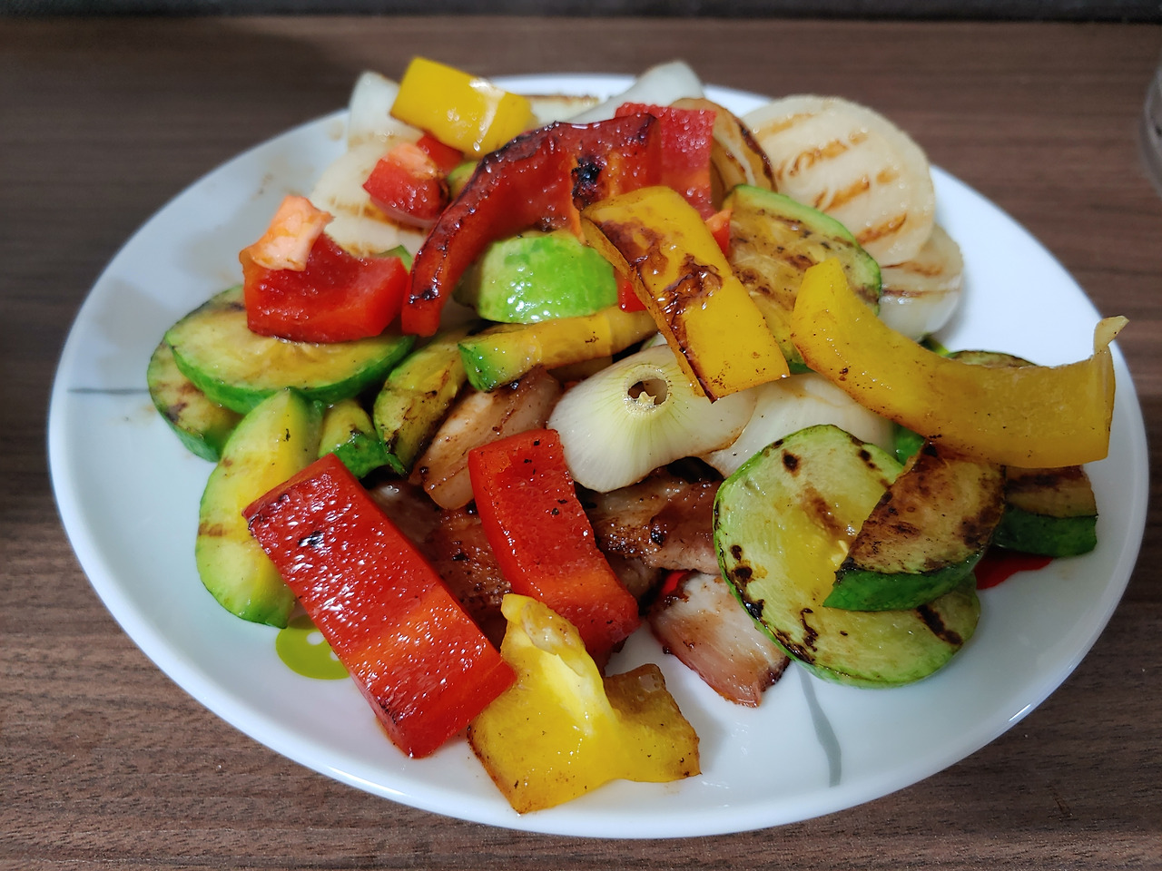 저녁을 준비합니다. 가볍게 알록달록 채소로요. 운동을 했잖아요. 그런데 채소 사이사이 고기 같은 것이 보여요. 오겹살이네요. 의식의 흐름대로 오겹살을 입에 넣어요. 운동은 어김없이 식욕을 불러오네요. 저만 그런가요?