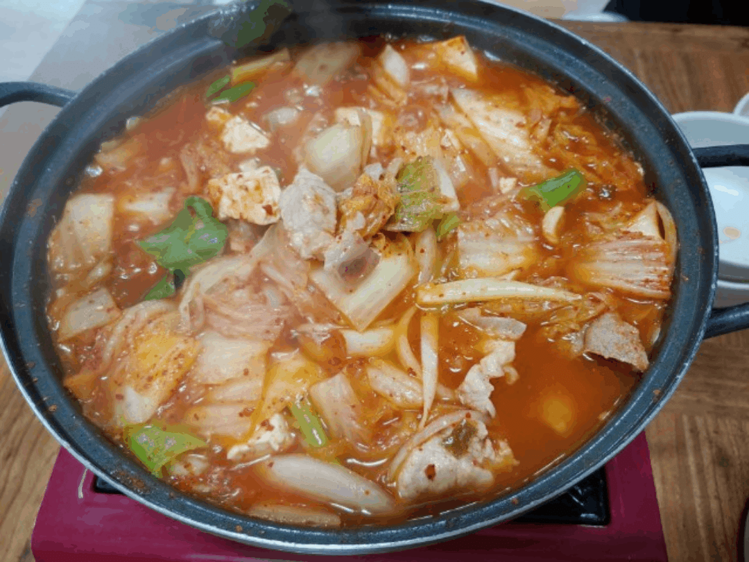 지금 오기로 했는데 먼저 가라고 하면 된다고, 먹고 가라 하세요. 냉큼 자리를 잡고 앉아요. 밑반찬을 들고 오시는데 허리도 제대로 못 펴시네요. 남편이 얼른 팔을 뻗어 쟁반을 받아요. 이윽고 기다리던 김치찌개가 나와요. 냄새가 기가 막혀요. 찬을 먼저 맛보니 찌개 맛도 기대가 되는 거 있죠? 보통 밑반찬 맛있는 집이 메인 요리도 잘하니까요.