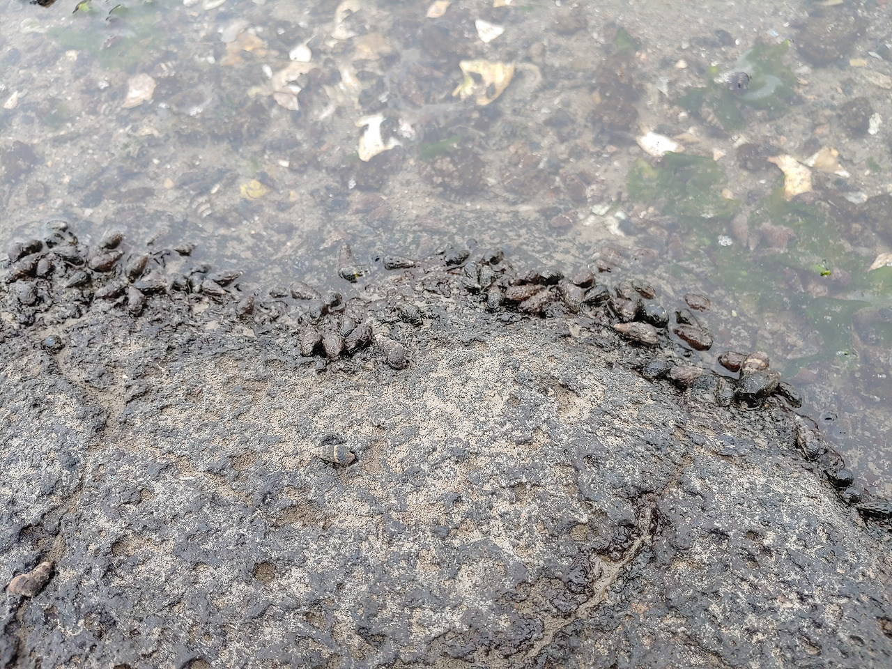 마을 어장 같아 보여요. 돌이 있는 어디든 다슬기가 주근깨처럼 다닥다닥 붙어있어요. 저 너머에는 마을 사람들이 뭔가를 열심히 줍고 있고요. 보말이 아닐까 해요. 궁금증이 많은 우리 가족은 가까이 걸어가 봐요. 한참 동안 물이 빠진 상태인가 봐요. 냄새가 그다지 좋지 않은걸요. 수북하게 쌓인 뿔소라 껍데기도 보이네요.