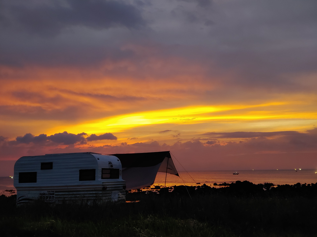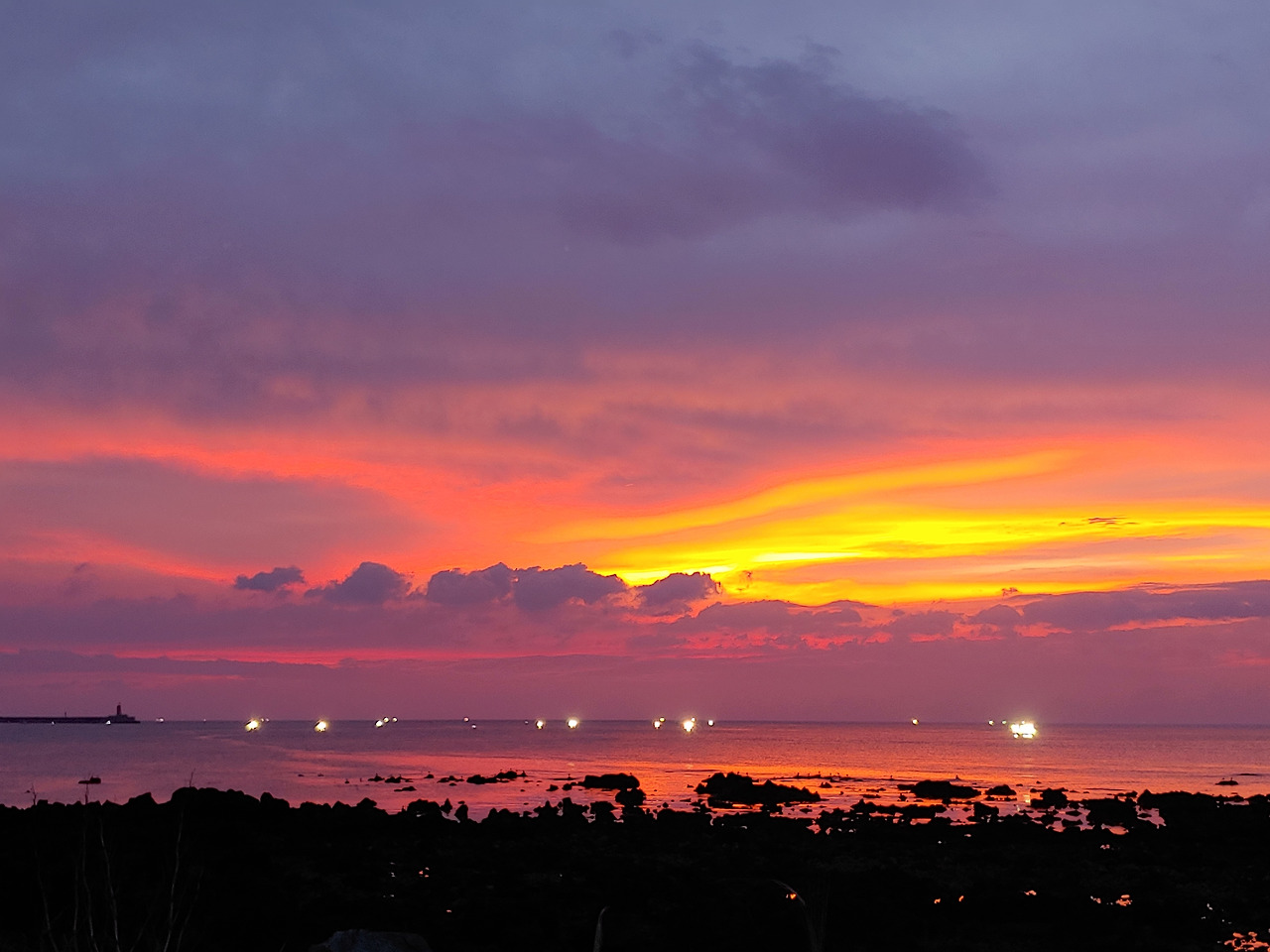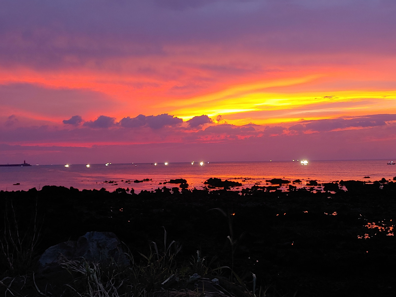삼양 바다는 검은 모래로 되어 해변이 엄청 스펙터클하게 예쁘지는 않아요. 그 대신 저녁노을이 기가 막힙니다. 이게 정말 내 눈으로 보고 있는 실제인가 싶을 정도로 아름다워요. 어두워질수록 붉어지는 하늘빛에 숨이 탁, 막혀와요.