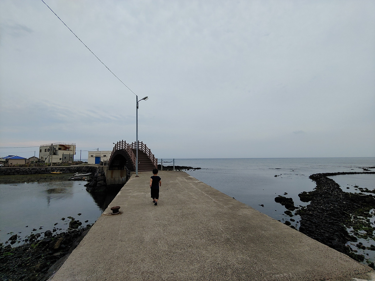 신촌포구쯤 되는 거 같아요. 배가 드나들 법한 다리가 있고 한적한 바닷가 마을이에요. 흐리긴 해도 걸어보고 싶은 동네네요.