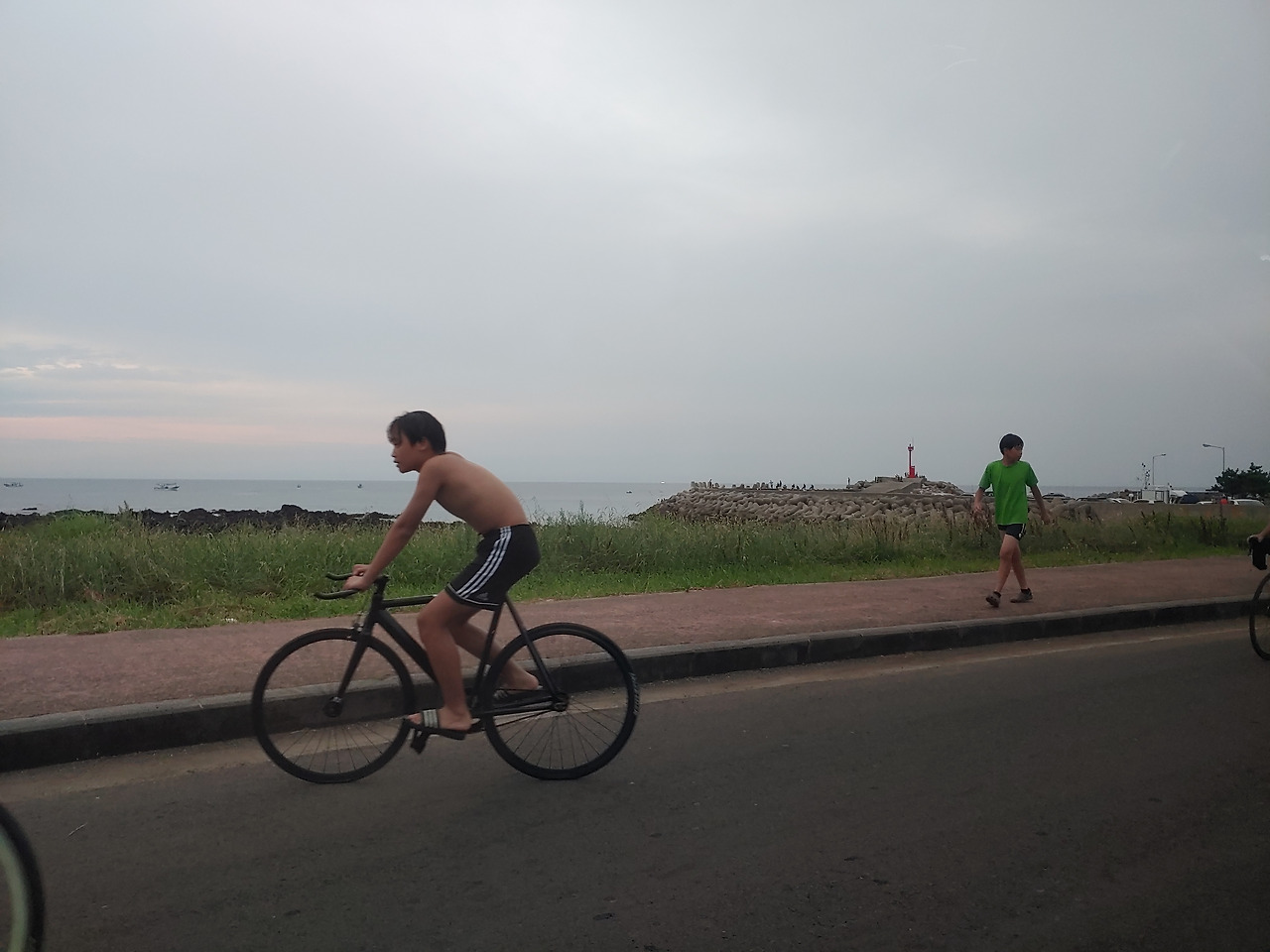 바다 다이빙을 마치고 귀가하는 제주 아이들도 하나둘씩 보이고요. 이 아이들은 이런 정경이 마치 피부처럼, 벽지처럼 익숙하겠죠? 얼마나 부러운지요.