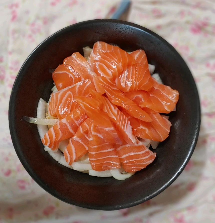 <좌> 망한 소고기뭇국, <우> 남편의 연어덮밥. 그 아래 굵은 양파 슬라이스