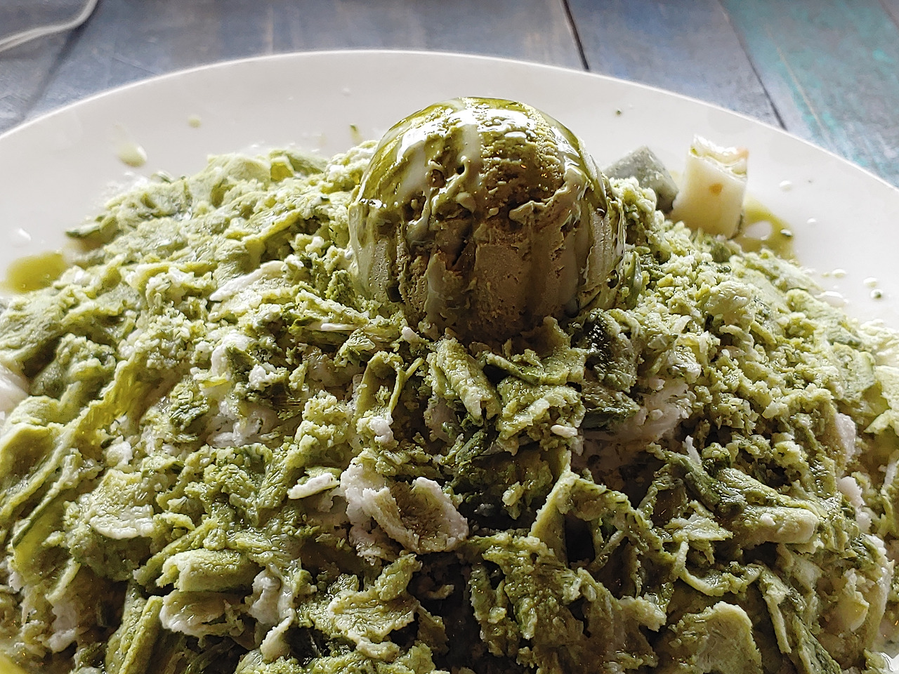 커다란 접시에 산처럼 쌓인 빙수는 달지 않아요. 빙수가 달지 않다니 이상하죠? 우유얼음과 녹차 얼음이 따로 또 같이 섞여있네요. 눈꽃빙수의 결은 아니고요. 대패 빙수에 가까워요. 사각사각 씹히는 맛이 있거든요. 떡도 보드랍게 찰지네요. 거의 다 먹었을 즈음, 바닥에 팥이 드러나요. 기대도 안 했던 것이 떡하니 있으니 별미인데요? 남편에게 자랑을 해요.