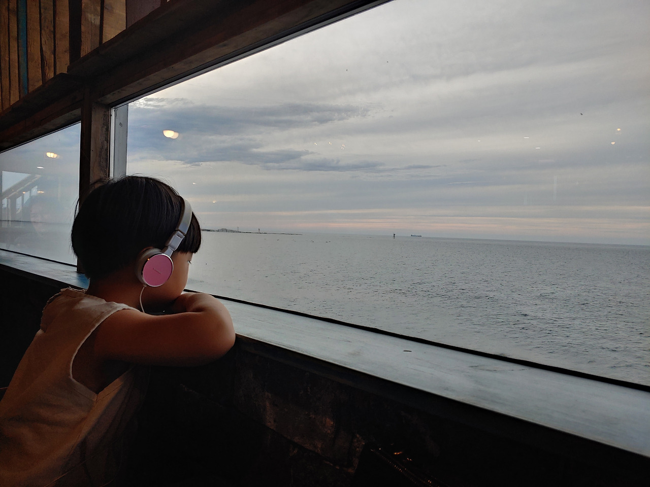 슬슬 해가 지네요. 옥상에서 바다를 내다보는 것을 끝으로 카페 놀이를 정리해요. 또다시 20분을 달려 집에 도착해요. 그리고 저녁을 먹이고 아이를 씻겨요. 거실에서 장난도 치고, 책도 읽어줘요. 8시가 되었으니 남편이 곧 오겠죠?