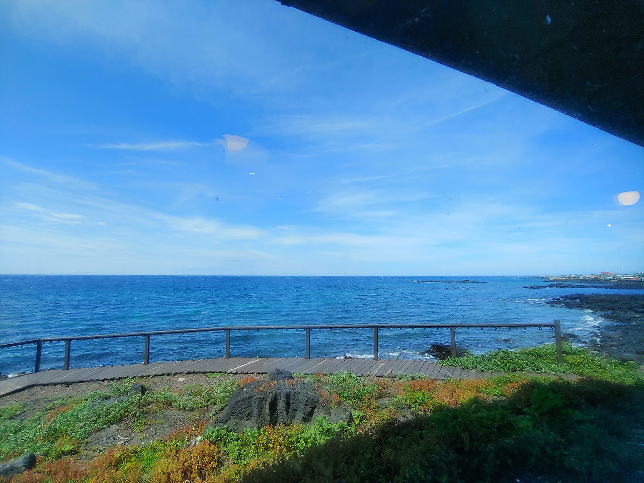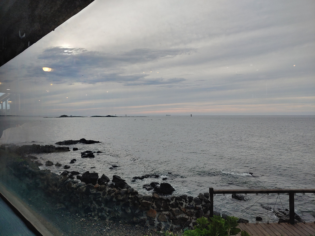차로 20분을 달려 카페에 도착합니다. 도민들도 자주 찾는 곳이라 이미 차가 많아요. 콘센트가 있는 곳에 자리를 잡고 말차 빙수를 주문해요. 오늘은 구름이 많아 전처럼 사진이 예쁘지 않네요.