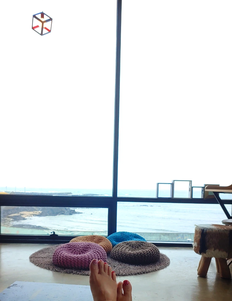 이번에는 남편 차례예요. 저희 가족, 로봇박물관 벌써 몇 번째거든요. 남편이 아이와 함께 들어가기로 했어요. 로봇 격투도 해야 하고 로봇댄스도 봐야 하고 계획이 많아요. 이제 저는 바다가 보이는 카페에 앉아 기다리기만 하면 돼요. 야호! 자유시간이네요.