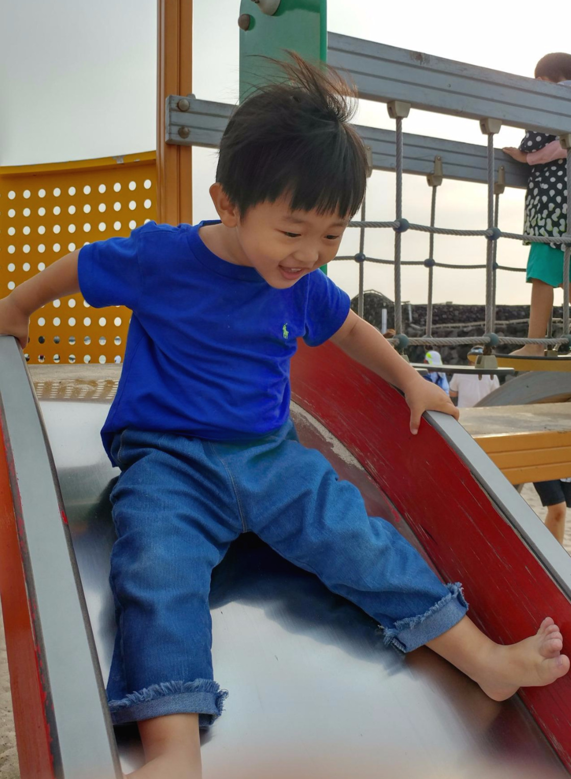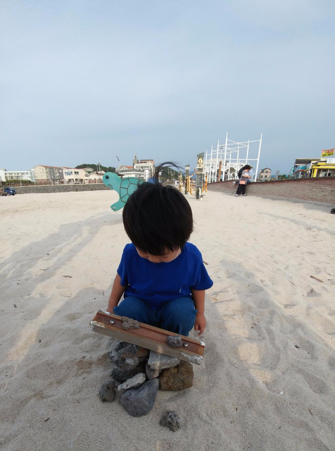 맨발의 겸이는 이리저리 잘도 뛰어다녔다. 노천탕도 들어가 구경해보고, 돼지등에도 올라가 보고, 돌맹이들을 아이삼아 엄마아빠놀이도 하면서, 쉼 없이 바다를 만끽하고 있었다. 바다가 보이는 미끄럼틀을 내려올 때의 아이의 기분을 상상해 보았는가. 바다를 향해 돌진하는 느낌이 들었을지도 모르겠다. 어른으로 치면, 바다가 보이는 카페에서 노닥거릴 때 느껴지는 '정신적 풍요로움'같은 것과 비교가 될는지.