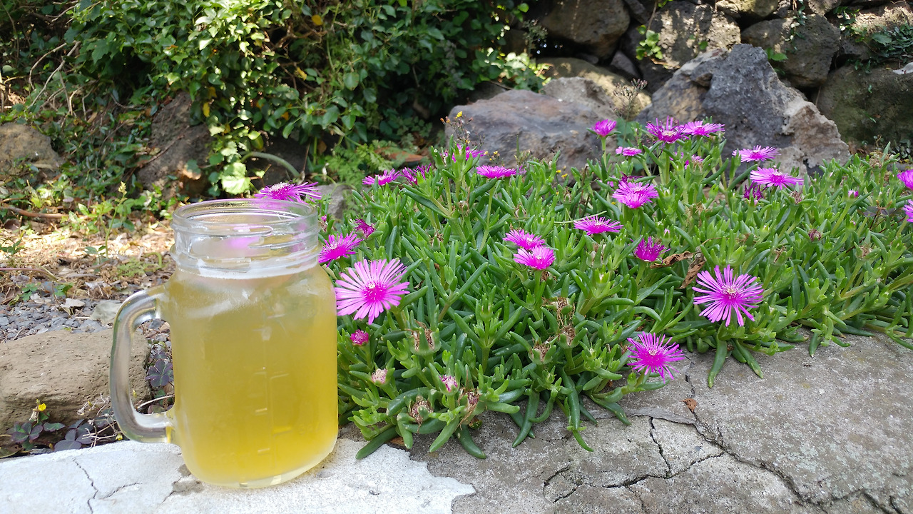 쥔장님이 올라가고 오래지 않아 다시 노크소리가 났다. 직접 만든 파인애플 에이드를 들고 오셨다. 겸이와 함께 안뜰로 나가 오붓하게 마셨다. 새소리와 푸릇한 초록들이 우리를 반기는 가운데.