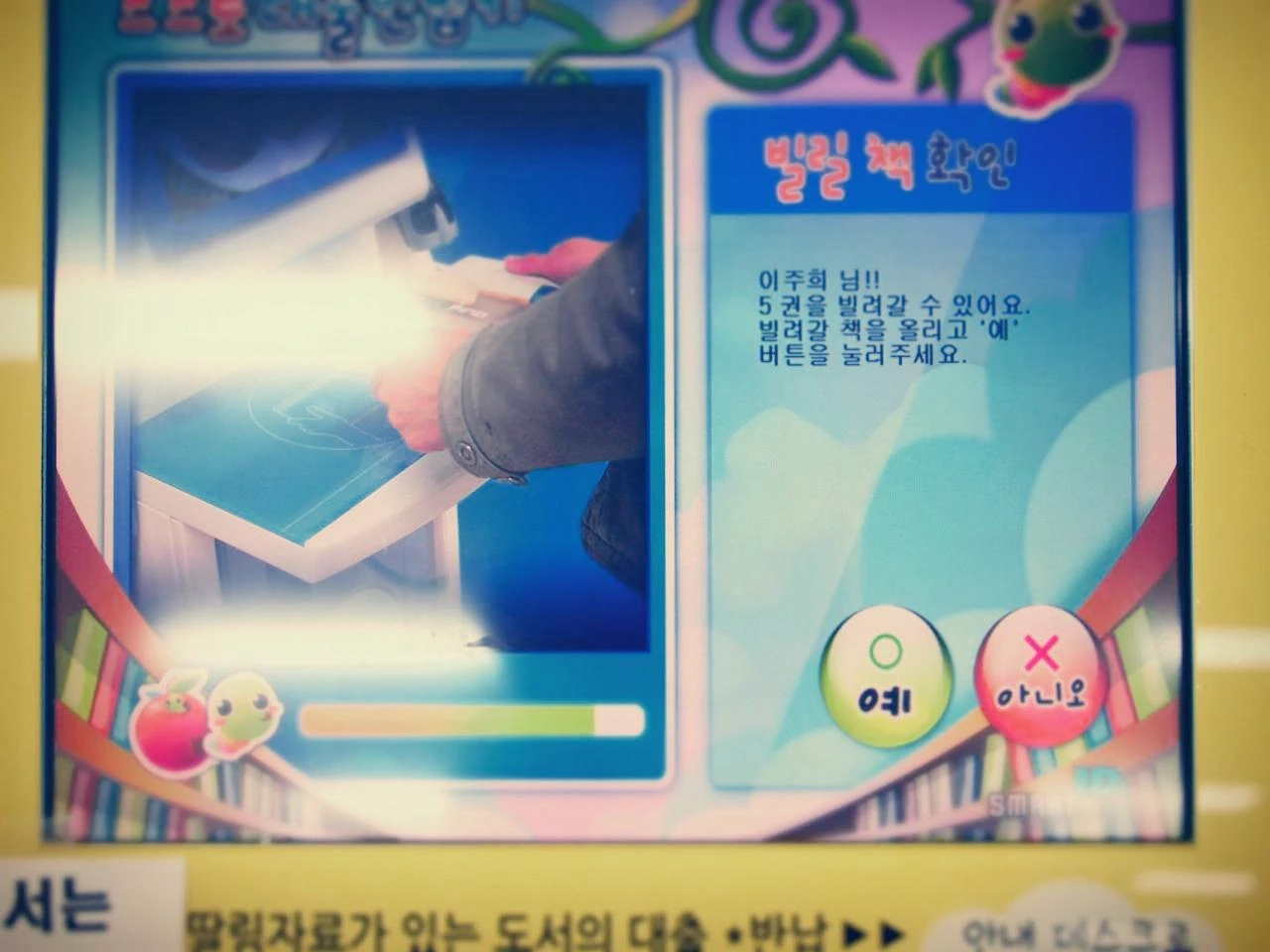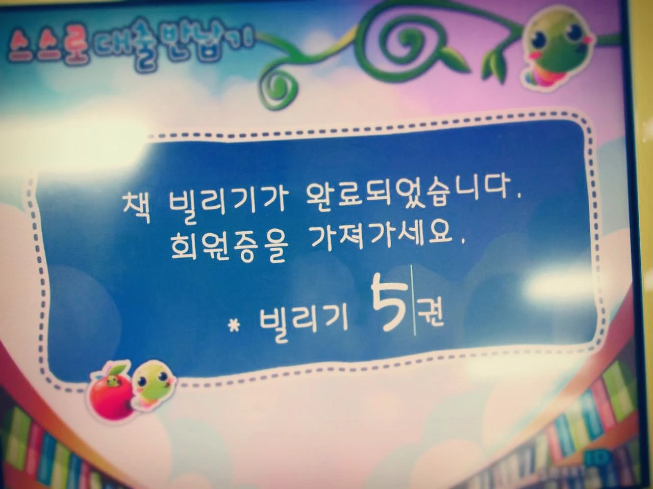 절차는 간단하다. 화면의 ‘책 빌리기’버튼을 누르고 옆의 카드리더기에 대출증을 올려놓고 빌릴 책은 기계 위에 올려놓는다. 내 이름과 대출 가능 권수가 뜨고, ‘예’버튼을 누르면 빌릴 책의 목록이 뜬다. 목록을 확인하고 비밀번호를 누르면 영수증이 출력되면서 대출 끝. 이 시설은 아마도 통합도서관 중에서 조금 규모가 있는 도서관에서만 있는 듯했다. 현재 내가 사는 곳 어린이도서관 내에도 이런 시설이 있기에 어렵지 않게 대출할 수 있었다.