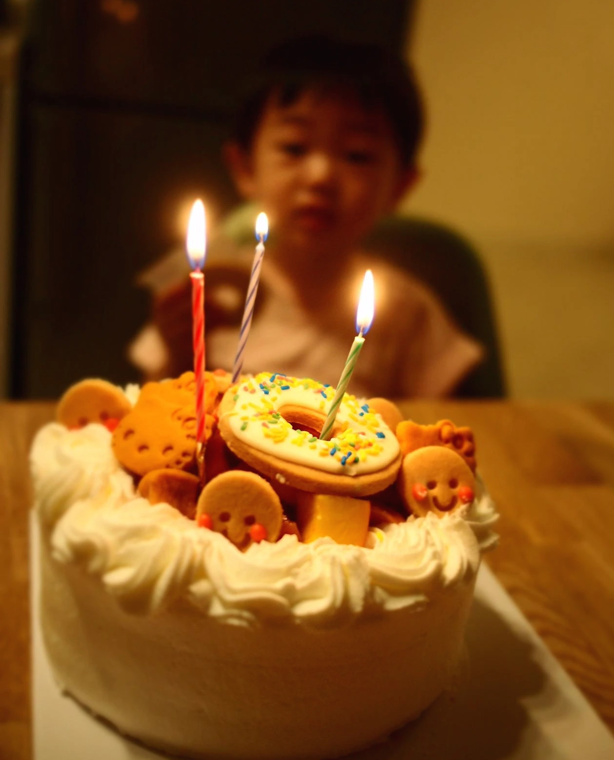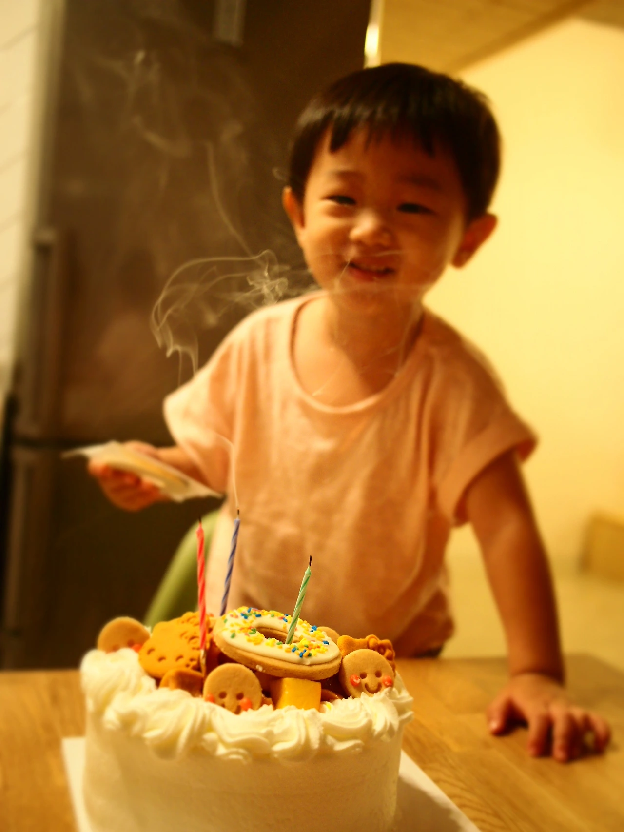 선잠이 깬 아이는 생일 축하를 할 거라는 말에 금세 표정이 밝아졌다. 케이크 자체의 모양은 아이 눈에 밋밋해 보일 수도 있기에, 함께 사온 키티쿠키와 스마일쿠키로 장식해주었다. ‘800일 축하합니다’로 노래를 마치고 촛불을 끄며 함박웃음을 짓는 아이.