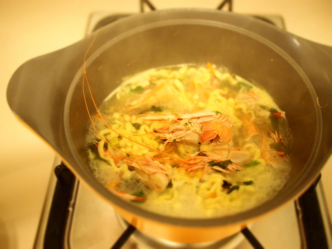 아이를 달래고, 아침을 준비했다. 지난번 냉장고에 얼려둔 가시발새우(일명, 딱새우)의 대가리를 넣고 라면을 끓이기로 했다. 물에 새우 대가리들을 잔뜩 넣고 팔팔 끓인 후 라면을 넣고 아이 것은 덜어 내고 나서 스프를 넣었다. 이윽고 완성된 새우맛 라면^^