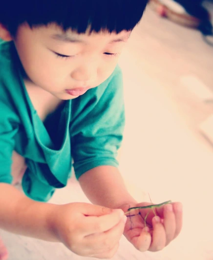 아이는 처음 보는 곤충에 조심스러워하면서 손을 뻗쳤다. 하지만, 힘없는 방아깨비는 아이의 무절제한 힘 조절 능력에 다리 하나마저 잃고 말았다. 방아깨비보다 더 놀란 아이의 눈에 금세 눈물이 고인다.