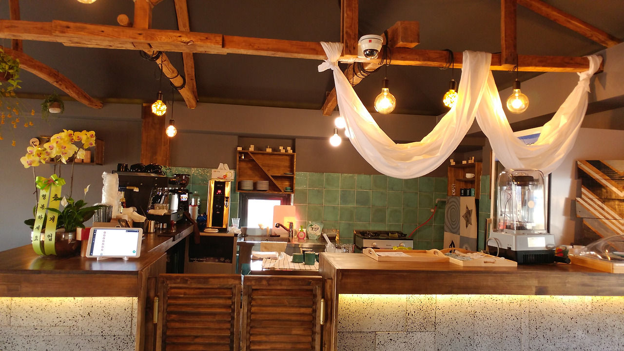 기존에 있던 건축물의 겉틀을 가급적 보존하면서 세련미를 더하기 위해 사용된 것들이 모두 아빠(남자쥔장님)의 손을 거쳐서 완성되었다는 사실. 메인공간과 화장실이 있는 바(Bar)형 공간(아마 저녁엔 PUB으로 운영될 것 같다), 그리고 마당을 끼고 있는 외양간 공간으로 구성되어 있다.