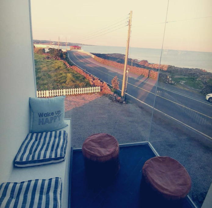 층고가 높아 들어서면서부터 속이 확 트이는 기분이다. 계단을 따라 2층으로 올라서는 벽면에는 재미있는 장식품들로 빼곡하다. 소파도 널찍하고 편해서 아이랑 두 다리 펴고 앉아 전면은 바다, 후면은 농가를 바라보는 기분이 여간 좋은 게 아니다.